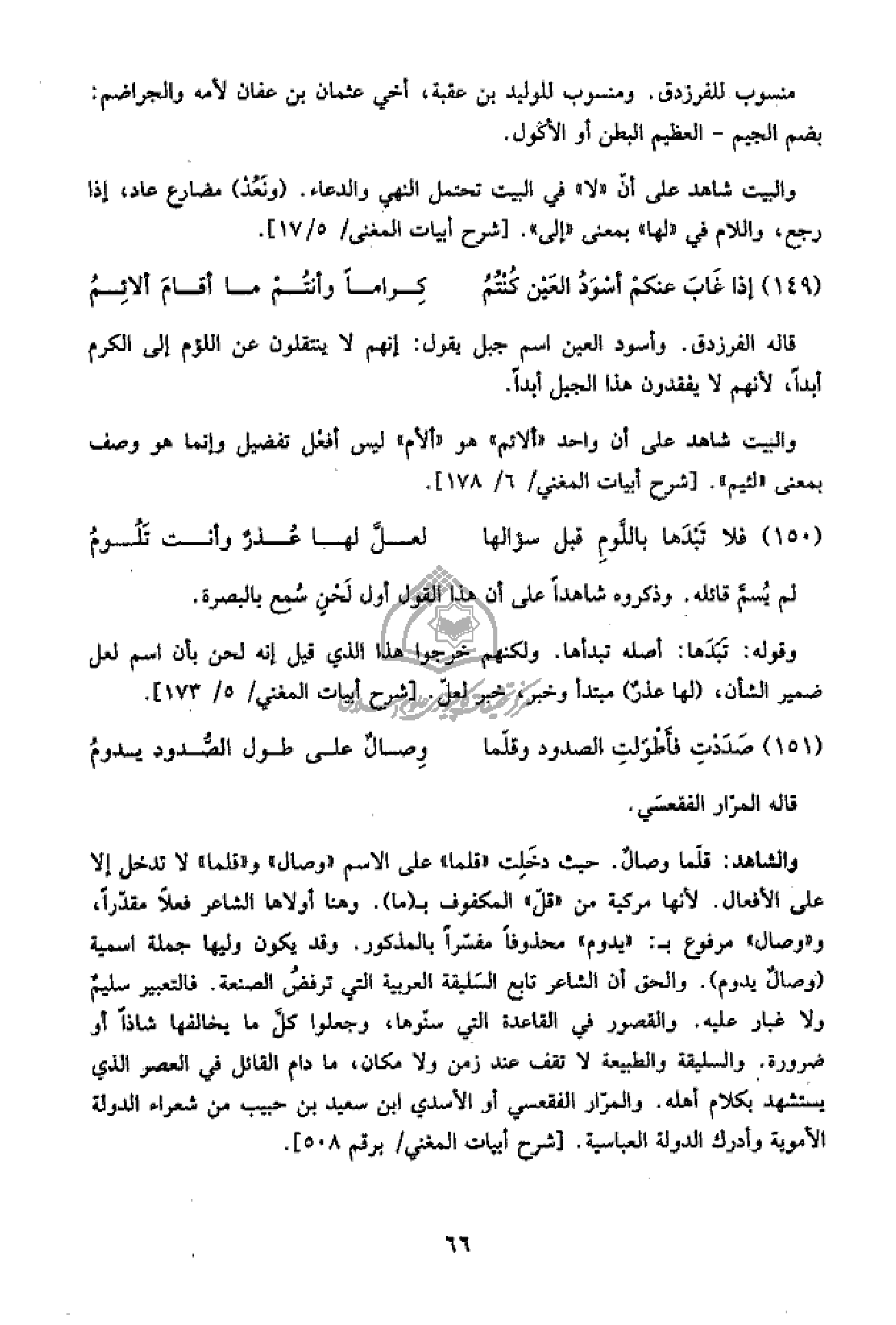 والشاهد: قلّما وصال. حيث دخلت «قلما» على الاسم «وصال» و «قلما» لا تدخل إلا على الأفعال. لأنها مركبة من «قلّ» المكفوف ب (ما). وهنا أولاها الشاعر فعلا مقدّرا، و «وصال» مرفوع ب: «يدوم» محذوفا مفسّرا بالمذكور. وقد يكون وليها جملة اسمية (وصال يدوم). والحق أن الشاعر تابع السليقة العربية التي ترفض الصنعة. فالتعبير سليم ولا غبار عليه. والقصور في القاعدة التي سنّوها، وجعلوا كلّ ما يخالفها شاذا أو ضرورة. والسليقة والطبيعة لا تقف عند زمن ولا مكان، ما دام القائل في العصر الذي يستشهد بكلام أهله. والمرّار الفقعسي أو الأسدي ابن سعيد بن حبيب من شعراء الدولة الأموية وأدرك الدولة العباسية. [شرح أبيات المغني/ برقم 508].