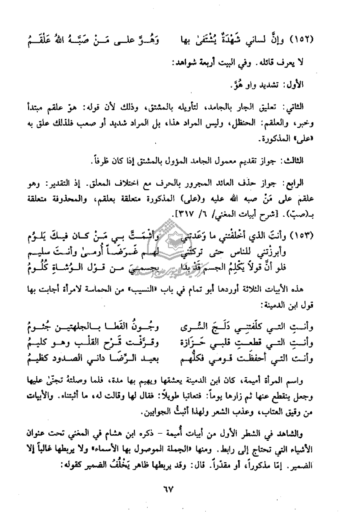 والشاهد في الشطر الأول من أبيات أميمة - ذكره ابن هشام في المغني تحت عنوان الأشياء التي تحتاج إلى رابط. ومنها «الجملة الموصول بها الأسماء» ولا يربطها غالبا إلا الضمير. إمّا مذكورا، أو مقدّرا. قال: وقد يربطها ظاهر يخلف الضمير كقوله: