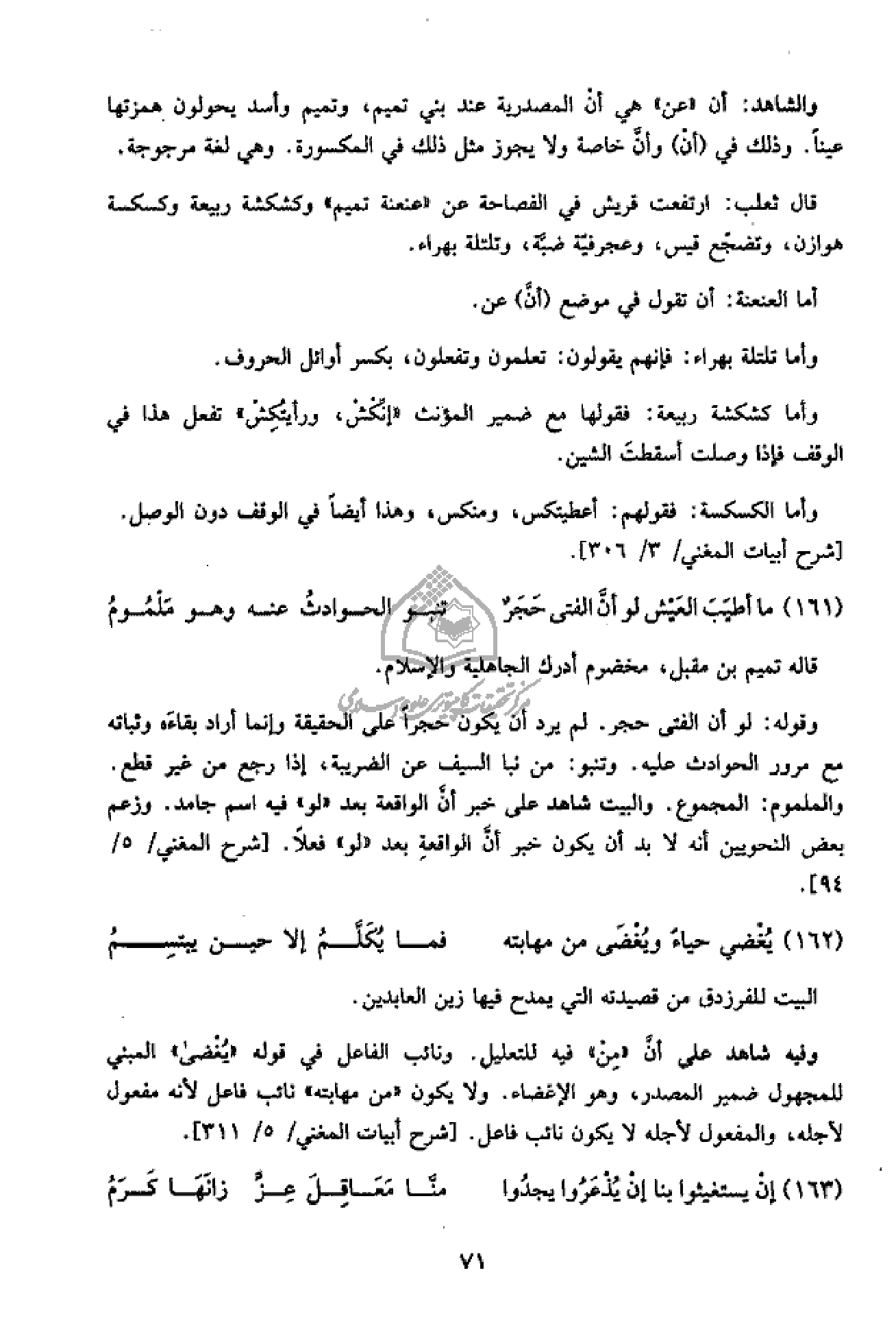 والشاهد: أن «عن» هي أن المصدرية عند بني تميم، وتميم وأسد يحولون همزتها عينا. وذلك في (أن) وأنّ خاصة ولا يجوز مثل ذلك في المكسورة. وهي لغة مرجوجة.