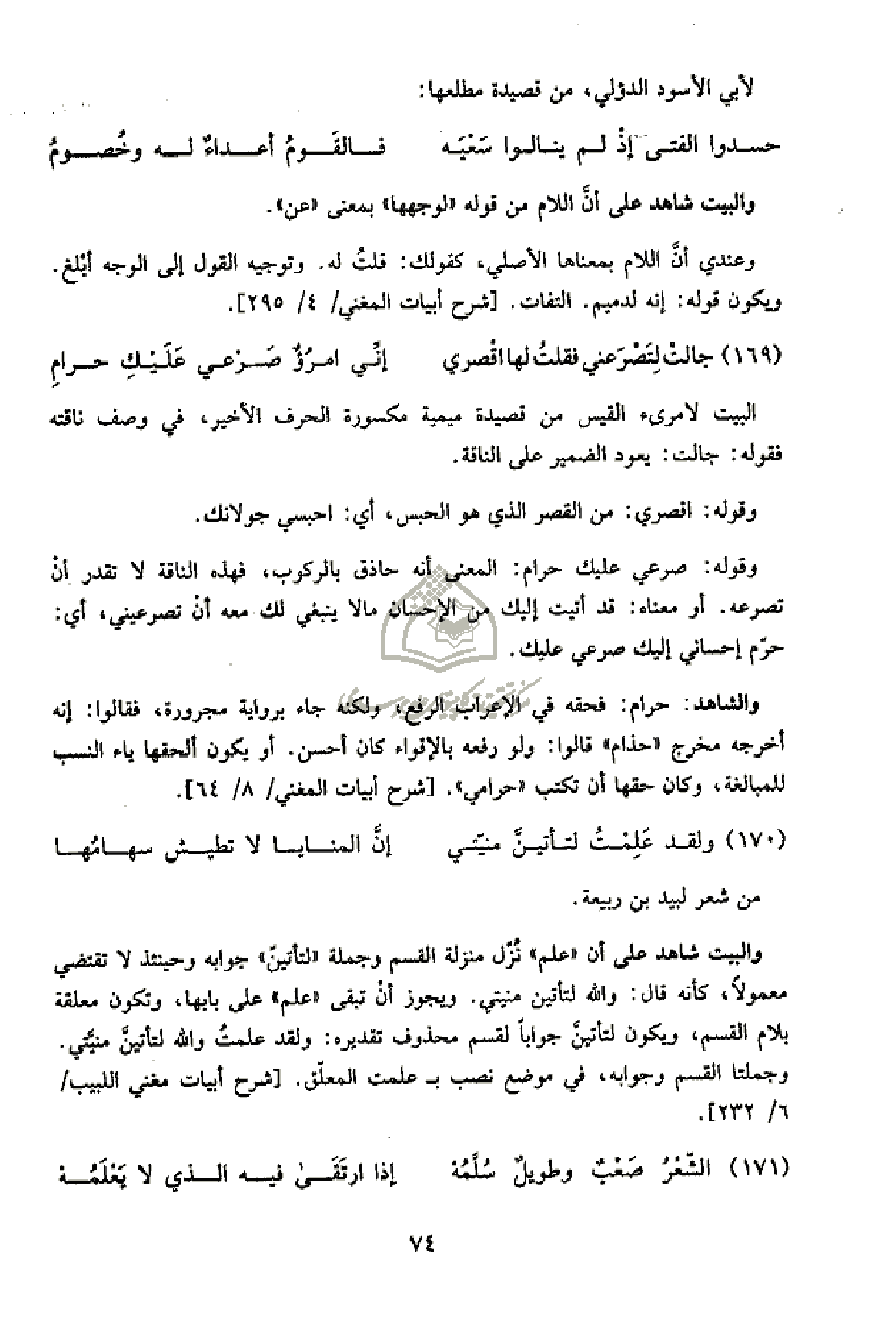 والشاهد: حرام: فحقه في الإعراب الرفع، ولكنه جاء برواية مجرورة، فقالوا: إنه أخرجه مخرج «حذام» قالوا: ولو رفعه بالإقواء كان أحسن. أو يكون ألحقها ياء النسب للمبالغة، وكان حقها أن تكتب «حرامي». [شرح أبيات المغني/ 8/ 64].