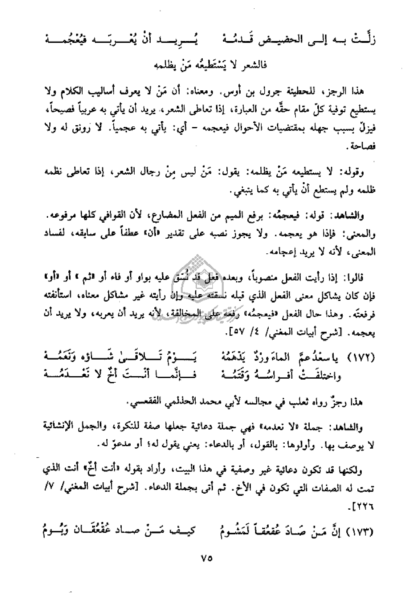 هذا الرجز، للحطيئة جرول بن أوس. ومعناه: أن من لا يعرف أساليب الكلام ولا يستطيع توفية كلّ مقام حقّه من العبارة، إذا تعاطى الشعر، يريد أن يأتي به عربيا فصيحا، فيزلّ بسبب جهله بمقتضيات الأحوال فيعجمه - أي: يأتي به عجميا. لا رونق له ولا فصاحة.