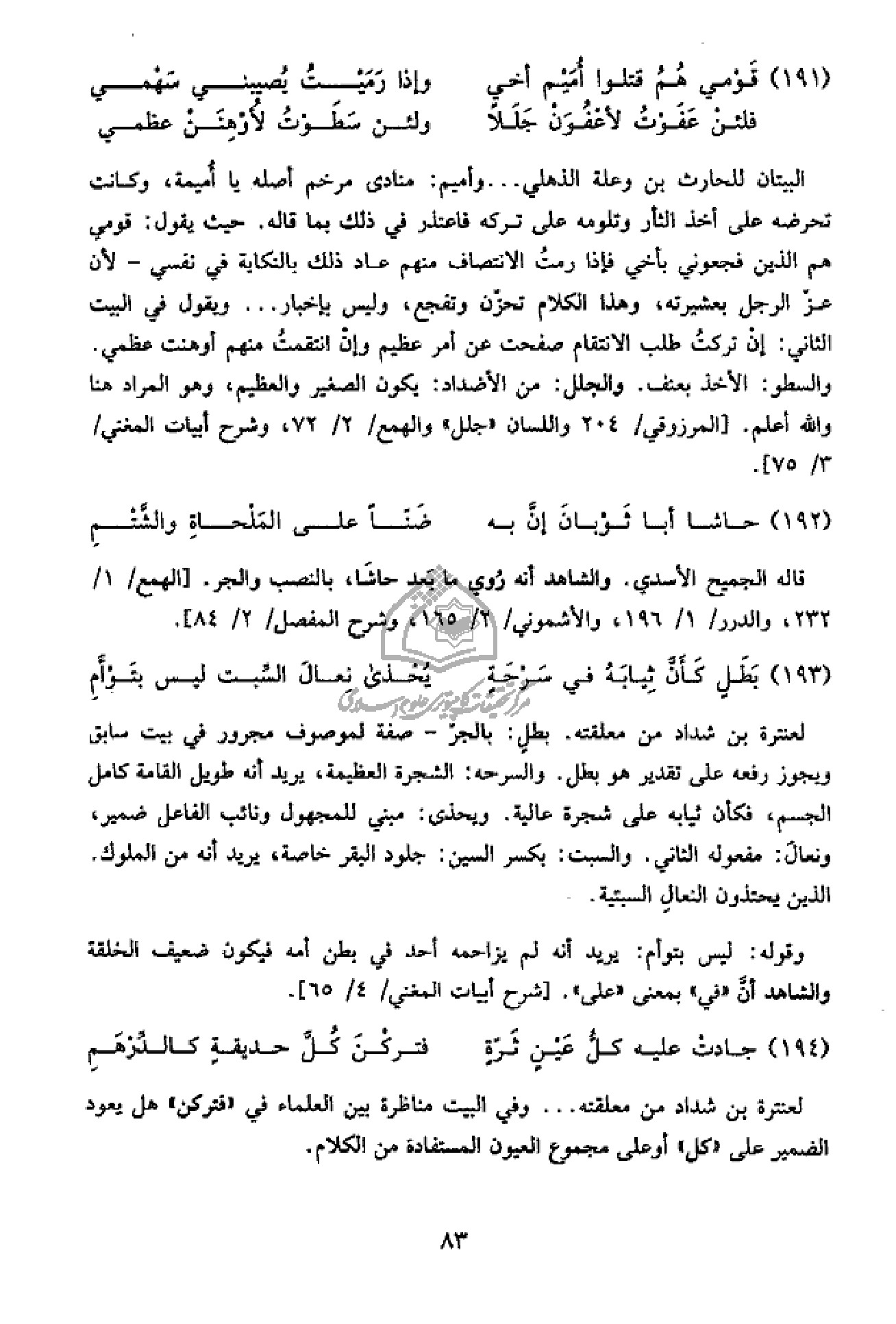 لعنترة بن شداد من معلقته. بطل: بالجرّ - صفة لموصوف مجرور في بيت سابق ويجوز رفعه على تقدير هو بطل. والسرحه: الشجرة العظيمة، يريد أنه طويل القامة كامل الجسم، فكأن ثيابه على شجرة عالية. ويحذى: مبني للمجهول ونائب الفاعل ضمير، ونعال: مفعوله الثاني. والسبت: بكسر السين: جلود البقر خاصة، يريد أنه من الملوك.