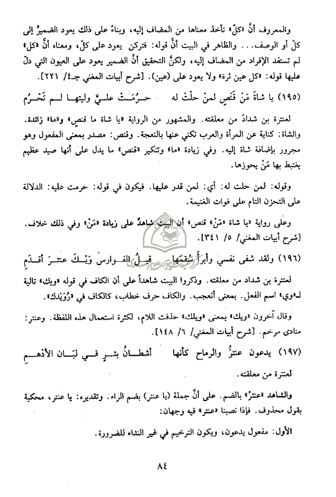 والشاهد «عنتر» بالضم. على أنّ جملة (يا عنتر) بضم الراء. وتقديره: يا عنتر، محكية بقول محذوف. فإذا نصبنا «عنتر» فيه وجهان: