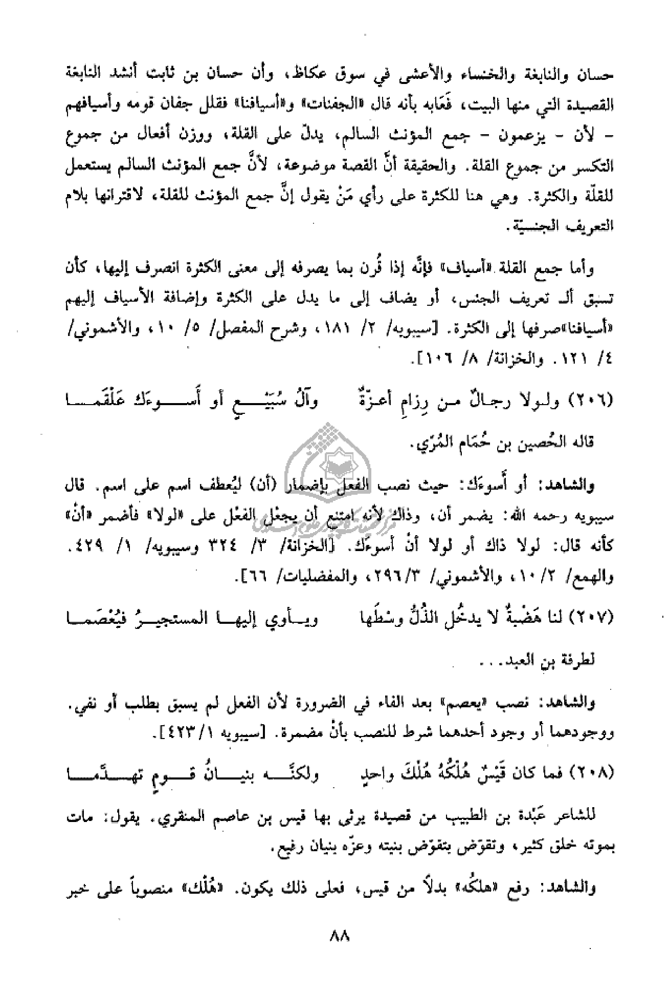 والشاهد: أو أسوءك: حيث نصب الفعل بإضمار (أن) ليعطف اسم على اسم. قال سيبويه رحمه الله: يضمر أن، وذاك لأنه امتنع أن يجعل الفعل على «لولا» فأضمر «أن» كأنه قال: لولا ذاك أو لولا أن أسوءك. [الخزانة/ 3/ 324