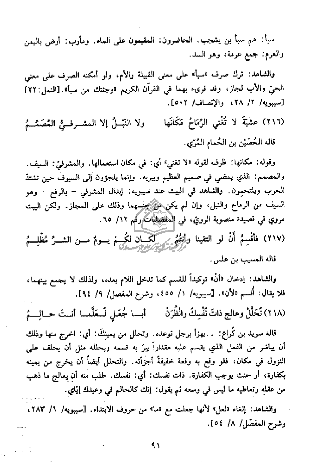 والشاهد: ترك صرف «سبأ» على معنى القبيلة والأم، ولو أمكنه الصرف على معني الحيّ والأب لجاز، وقد قرئ بهما في القرآن الكريم «وجئتك من سبأ». [النمل: 22] [سيبويه/ 2/ 28، والإنصاف/ 502].