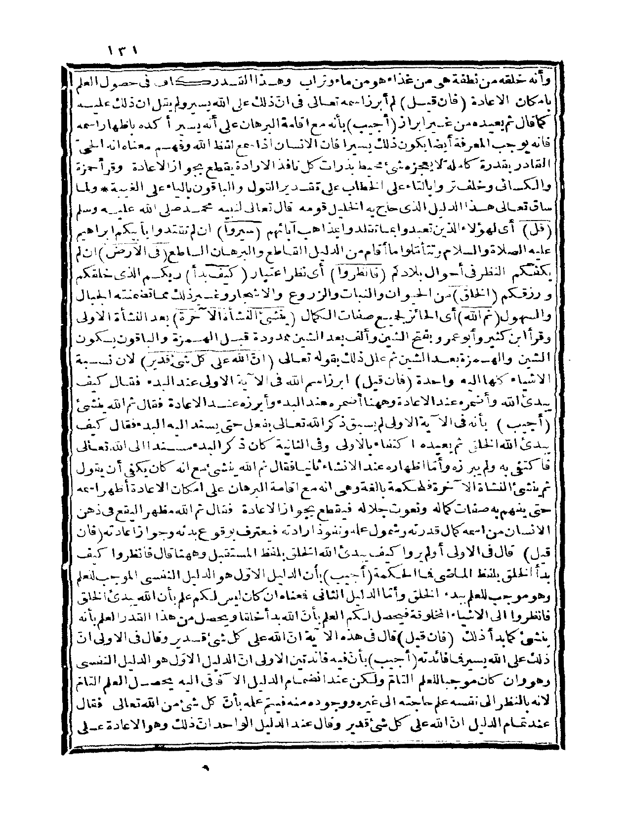 فإن قيل قال في هذه الآية: {إنّ الله على كل شيء قدير} وقال في الأولى: {إن ذلك على الله يسير} فما فائدته؟ أجيب بأنّ فيه فائدتين الأولى أن الدليل الأوّل هو الدليل: النفسي وهو وإن كان موجباً للعلم التامّ ولكن عند انضمام الدليل الآفاقي إليه يحصل العلم التامّ لأنه بالنظر إلى نفسه علم حاجته إلى غيره ووجوده منه فيتم علمه بأنّ كل شيء من الله تعالى فقال عند تمام الدليل: {إنّ الله على كل شيء قدير} وقال عند الدليل الواحد إنّ ذلك وهو الإعادة على