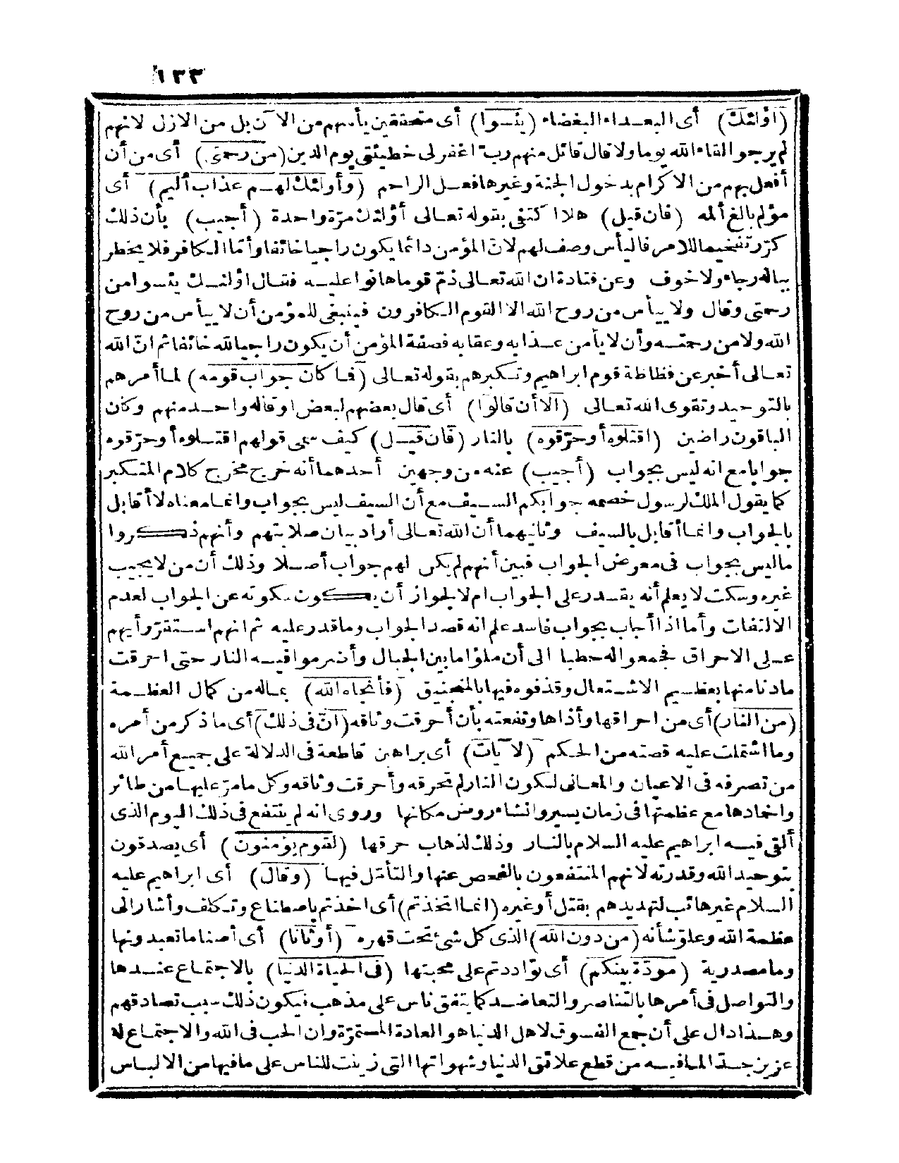 {فما كان جواب قومه} لما أمرهم بالتوحيد وتقوى الله تعالى {إلا أن قالوا} أي: قال بعضهم لبعض أو قاله واحد منهم وكان الباقون راضين {اقتلوه أو حرّقوه} بالنار، فإن قيل كيف سمى قولهم اقتلوه أو حرّقوه جواباً مع أنه ليس بجواب؟ أجيب عنه من وجهين: أحدهما: أنه خرج مخرج كلام المتكبر كما يقول الملك لرسول خصمه جوابكم السيف مع أن السيف ليس بجواب وإنما معناه لا أقابل بالجواب وإنما أقابل بالسيف، وثانيهما: أن الله تعالى أراد بيان صلابتهم وأنهم ذكروا ما ليس بجواب في معرض الجواب فبين أنهم لم يكن لهم جواب أصلاً، وذلك أن من لا يجيب غيره وسكت لا يعلم أنه يقدر على الجواب أم لا لجواز أن يكون سكوته عن الجواب لعدم الالتفات، وأما إذا أجاب بجواب فاسد علم أنه قصد الجواب وما قدر عليه، ثم إنهم استقرّ رأيهم على الإحراق فجمعوا له حطباً إلى أن ملؤوا ما بين الجبال وأضرموا فيه النار حتى أحرقت ما دنا منها بعظيم الاشتعال وقذفوه فيها بالمنجنيق {فأنجاه الله} بما له من كمال العظمة {من النار} أي: من إحراقها وأذاها ونفعته بأن أحرقت وثاقه {إن في ذلك} أي: ما ذكر من أمره وما اشتملت عليه قصته من الحكم {لآيات} أي: براهين قاطعة على جميع أمر الله من تصرفه في الأعيان والمعاني لكون النار لم تحرقه وأحرقت وثاقه وكل ما مرّ عليها من طائر وإخمادها مع عظمتها في زمان يسير وإنشاء روض مكانها، وروي أنه لم ينتفع في ذلك اليوم الذي ألقي فيه إبراهيم عليه السلام بالنار وذلك لذهاب حرقها {لقوم يؤمنون} أي: يصدقون بتوحيد الله وقدرته لأنهم المنتفعون بالفحص عنها والتأمّل فيها.