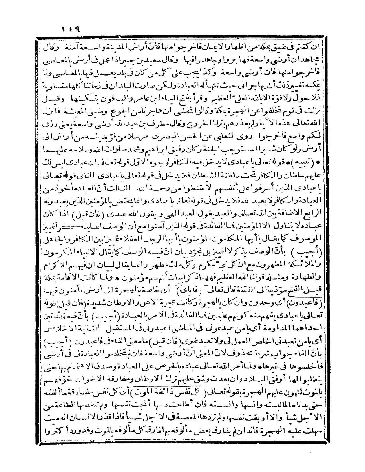 الثالث: أنّ العباد مأخوذ من العبادة والكافر لا يعبد الله فلا يدخل في قوله تعالى {يا عبادي} وإنما يختص بالمؤمنين الذين يعبدونه، الرابع: الإضافة بين الله تعالى والعبد يقول العبد إلهي ويقول الله عبدي، فإن قيل: إذا كان عباده لا يتناول إلا المؤمنين فما الفائدة في قوله {الذين آمنوا} مع أن الوصف إنما يذكر لتمييز الموصوف كما يقال: يا أيها المكلفون المؤمنون، يا أيها الرجال العقلاء تمييزاً بين الكافر والجاهل؟ أجيب: بأنّ الوصف يذكر لا لتمييز بل لمجرّد بيان أنّ فيه الوصف كما يقال: الأنبياء المكرمون، والملائكة المطهرون، مع أن كل نبيّ مكرم، وكل ملك مطهر، وإنما يقال لبيان أن فيهم الإكرام والطهارة، ومثله قولنا، الله العظيم فههنا ذكر لبيان أنهم مؤمنون ولما كانت الإقامة بمكة قبل الفتح موِدّية إلى الفتنة قال تعالى: {فإياي} أي: خاصة بالهجرة إلى أرض تأمنون فيها {فاعبدون} أي: وحدون وإن كان بالهجرة وكانت هجرة الأهل والأوطان شديدة، فإن قيل: قوله تعالى: {يا عبادي} يفهم منه كونهم عابدين فما الفائدة في الأمر بالعبادة؟ أجيب: بأنّ فيه فائدتين أحداهما: المداومة أي: يا من عبدتموني في الماضي اعبدوني في المستقبل، الثانية: الإخلاص أي: يا من تعبدني أخلص العمل لي ولا تعبد غيري، فإن قيل ما معنى الفاء في فاعبدون؟ أجيب: بأن الفاء جواب شرط محذوف لأنّ المعنى إنّ أرضي واسعة فإن لم تخلصوا العبادة لي في أرضي فأخلصوها في غيرها، ولما أمر الله تعالى عباده بالحرص على العبادة وصدق الاهتمام بها حتى يتطلبوا لها أوفق البلاد وإن بعدت وشق عليهم ترك الأوطان ومفارقة الإخوان خوّفهم بالموت لتهون عليهم الهجرة بقوله تعالى: