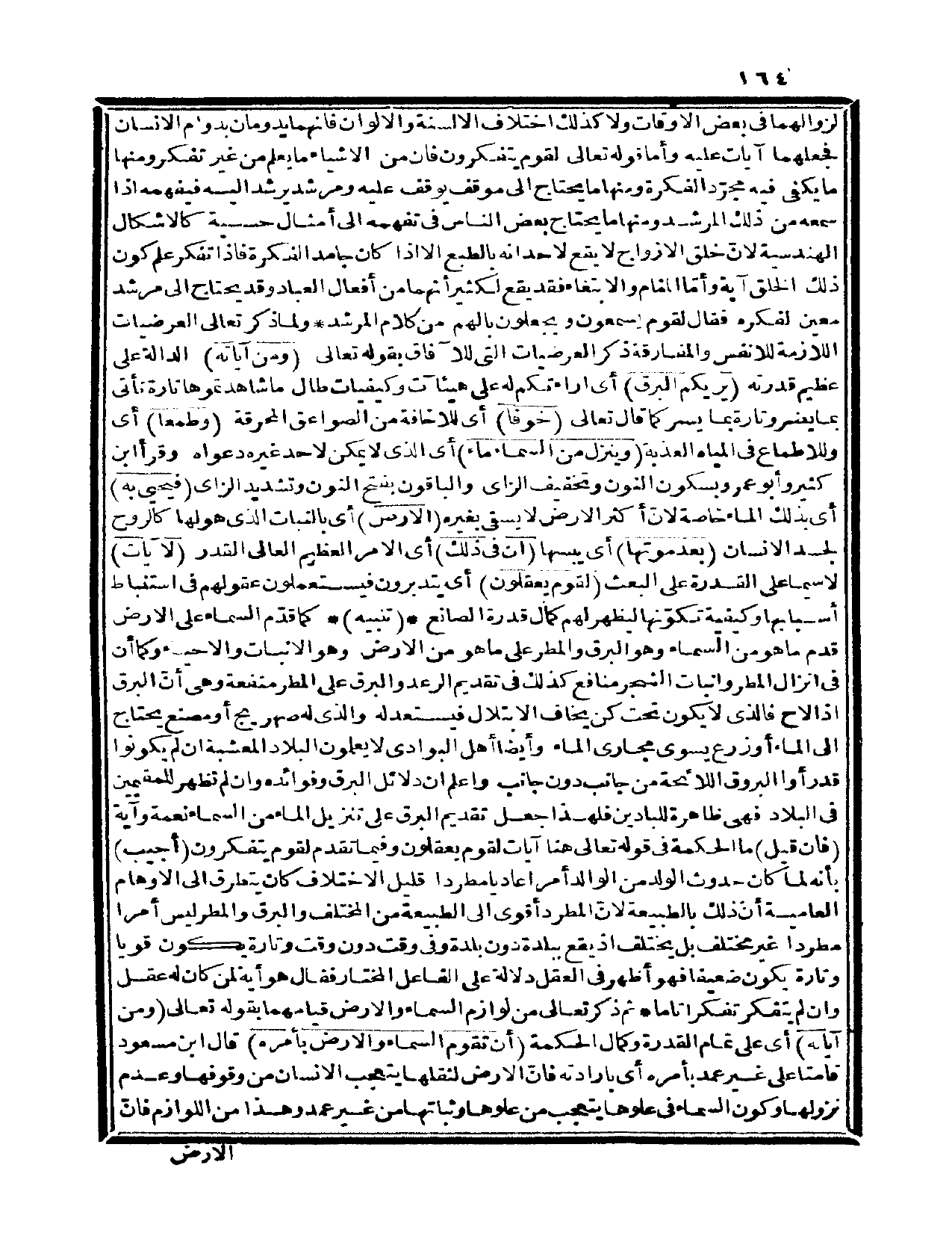 واعلم أن دلائل البرق وفوائده وإن لم تظهر للمقيمين في البلاد فهي ظاهرة للبادين، فلهذا جعل تقديم البرق على تنزيل الماء من السماء نعمة وآية، فإن قيل: ما الحكمة في قوله تعالى هنا {آيات لقوم يعقلون} وفيما تقدم {لقوم يتفكرون} ؟ أجيب: بأنه لما كان حدوث الولد من الوالد أمراً عادياً مطرداً قليل الاختلاف كان يتطرق إلى الأوهام العامية أنّ ذلك بالطبيعة لأنّ المطرد أقوى إلى الطبيعة من المختلف، والبرق والمطر ليس أمراً مطرداً غير مختلف بل يختلف إذ يقع ببلدة دون بلدة، وفي وقت دون وقت، وتارة يكون قوياً وتارة يكون ضعيفاً، فهو أظهر في العقل دلالة على الفاعل المختار فقال هو آية لمن كان له عقل وإن لم يتفكر تفكراً تاماً، ثم ذكر تعالى من لوازم السماء والأرض قيامهما بقوله تعالى: