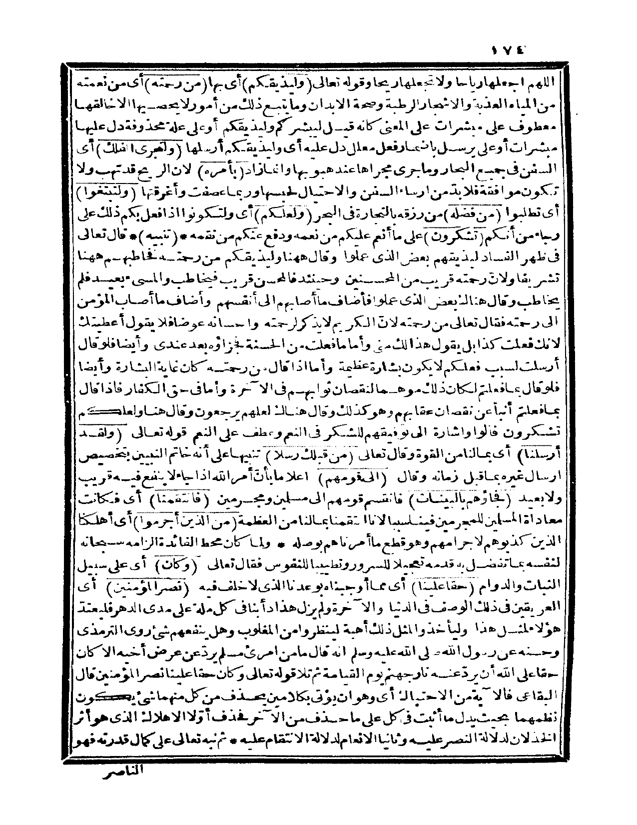 وقال ههنا {وليذيقكم من رحمته} فخاطبهم ههنا تشريفاً ولأنّ رحمته قريب من المحسنين وحينئذ فالمحسن قريب فيخاطب، والمسيء بعيد فلم يخاطب، وقال هناك {بعض الذي عملوا} فأضاف ما أصابهم إلى أنفسهم وأضاف ما أصاب المؤمن إلى رحمته فقال تعالى: {من رحمته} لأنّ الكريم لا يذكر لرحمته وإحسانه عوضاً فلا يقول: أعطيتك لأنك فعلت كذا بل يقول: هذا لك مني، وأما ما فعلت من الحسنة فجزاؤه بعد عندي. وأيضاً فلو قال: أرسلت لسبب فعلكم لا يكون بشارة عظيمة، وأما إذا قال: من رحمته كان غاية البشارة، وأيضاً فلو قال: بما فعلتم لكان ذلك موهماً لنقصان ثوابهم في الآخرة، وأما في حق الكفار فإذا قال: بما فعلتم أنبأ عن نقصان عقابهم وهو كذلك وقال هناك {لعلهم يرجعون} وقال هنا: {ولعلكم تشكرون} فالواو إشارة إلى توفيقهم للشكر في النعم، وعطف على النعم قوله تعالى: