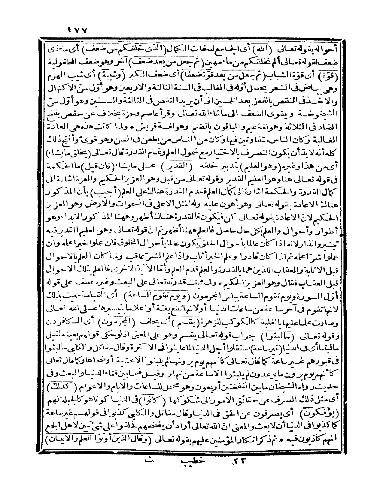 {الله} أي: الجامع لصفات الكمال {الذي خلقكم من ضعف} أي: ماء ذي ضعف لقوله تعالى {ألم نخلقكم من ماء مهين} {ثم جعل من بعد ضعف} آخر وهو ضعف الطفولية {قوة} أي: قوّة الشباب {ثم جعل من بعد قوّة ضعفاً} أي: ضعف الكبر {وشيبة} أي: شيب الهرم وهي بياض في الشعر يحصل أوّله في الغالب في السنة الثالثة والأربعين وهو أوّل سنّ الاكتهال، والأخذُ في النقص بالفعل بعد الخمسين إلى أن يزيد النقص في الثالثة والستين وهو أوّل سنّ الشيخوخة، ويقوى الضعف إلى ما شاء الله تعالى، وقرأ عاصم وحمزة بخلاف عن حفص بفتح الضاد في الثلاثة وهو لغة تميم، والباقون بالضم وهو لغة قريش، ولما كانت هذه هي العادة الغالبة وكان الناس متفاوتين فيها وكان من الناس من يطعن في السن وهو قويّ وأنتج ذلك كله لابدّ أن يكون التصرف بالاختيار مع شمول العلم وتمام القدرة قال تعالى {يخلق ما يشاء} أي: من هذا وغيره {وهو العليم} بتدبير خلقه {القدير} على ما يشاء.