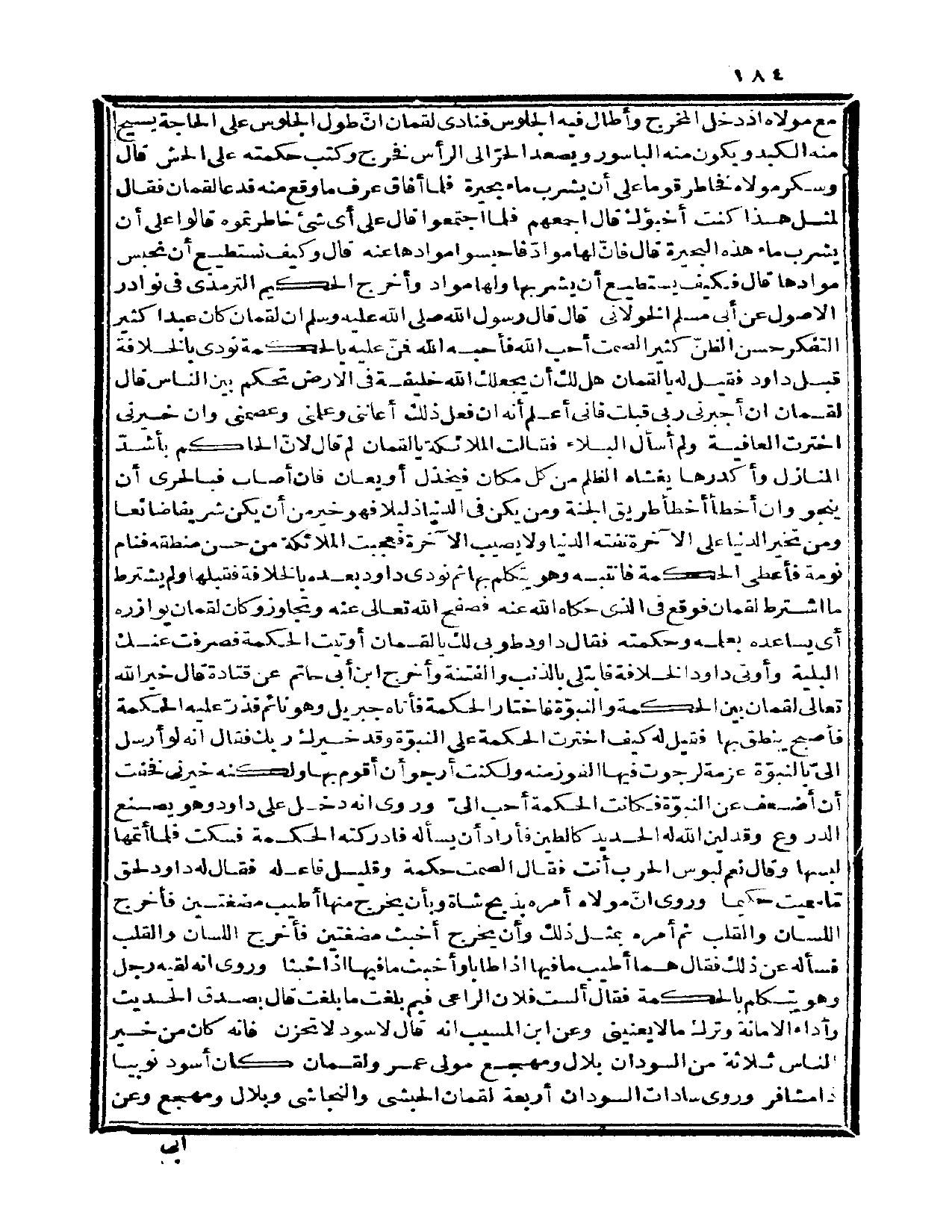 مع مولاه إذ دخل المخرج وأطال فيه الجلوس فنادى لقمان أنّ طول الجلوس على الحاجة يسيح منه الكبد ويكون منه الباسور ويصعد الحرّ إلى الرأس فخرج وكتب حكمته على الحش. قال: وسكر مولاه فخاطر قوماً على أن يشرب ماء بحيرة فلما أفاق عرف ما وقع منه فدعا لقمان فقال لمثل هذا كنت أخبؤك قال اجمعهم فلما اجتمعوا قال على أي. شيء خاطرتموه. قالوا: على أن يشرب ماء هذه البحيرة. قال: فإن لها موادّاً فاحبسوا موادها عنه، قال: وكيف نستطيع أن نحبس موادها. قال: فكيف يستطيع أن يشربها ولها مواد.