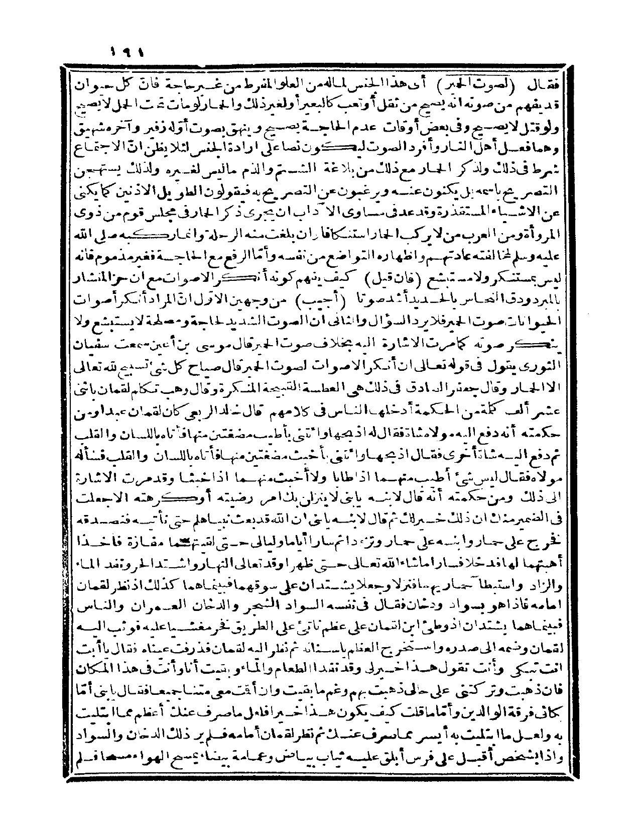فإن قيل كيف يفهم كونه أنكر الأصوات مع أن حز المنشار بالمبرد ودق النحاس بالحديد أشد صوتاً؟ أجيب: من وجهين: الأوّل: المراد أنكر أصوات الحيوانات صوت الحمير فلا يرد السؤال، والثاني: أن الصوت الشديد لحاجة ومصلحة لا يستبشع ولا ينكر صوته كما مرت الإشارة إليه، بخلاف صوت الحمير، قال موسى بن أعين سمعت سفيان الثوري يقول في قوله تعالى {إن أنكر الأصوات لصوت الحمير} قال: صياح كل شيء تسبيح لله تعالى إلا الحمار، وقال جعفر الصادق في ذلك: هي العطسة القبيحة المنكرة، وقال وهب: تكلم لقمان باثني عشر ألف كلمة من الحكمة أدخلها الناس في كلامهم.