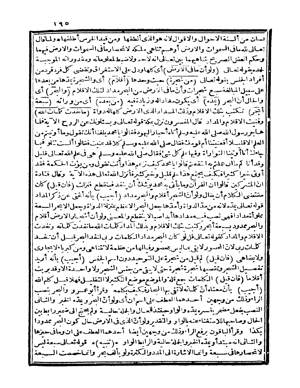 الآية فلما هاجر رسول الله صلى الله عليه وسلم أتاه أحبار اليهود فقالوا يا محمد بلغنا أنك تقول وما أوتيتم من العلم إلا قليلا أفعنيتنا أم قومك فقال صلى الله عليه وسلم «كلاً قد عنيت، فقالوا: ألست تتلو فيما جاءك أنّا أوتينا التوراة وفيها علم كل شيء فقال: صلى الله عليه وسلم هي في علم الله تعالى قليل وقد أتاكم ما إن عملتم به انتفعتم، قالوا: يا محمد كيف تزعم هذا وأنت تقول ومن يؤت الحكمة فقد أوتي خيراً كثيراً فكيف يجتمع هذا علم قليل وخير كثير؟ فأنزل الله تعالى هذه الآية» ، وقال قتادة إنّ المشركين قالوا: إن القرآن وما يأتي به محمد يوشك أن ينفد فينقطع فنزلت، فإن قيل كان مقتضى الكلام أن يقال: ولو أنّ الشجر أقلام والبحر مداد؟ أجيب: بأنه أغنى عن ذكر المداد قوله تعالى يمدّه لأنه من مدّ الدواة وأمدّها جعل البحر الأعظم بمنزلة الدواة وجعل الأبحر السبعة مملوأة مداداً فهي تصب فيه مدادها أبداً صباً لا ينقطع، والمعنى: ولو أن أشجار الأرض أقلام، والبحر ممدود بسبعة أبحر وكتبت بتلك الأقلام وبذلك المداد كلمات الله ما نفدت كلماته ونفدت الأقلام والمداد كقوله تعالى {قل لو كان البحر مداد الكلمات ربي لنفد البحر قبل أن تنفد كلمات ربي} (الكهف: 109)