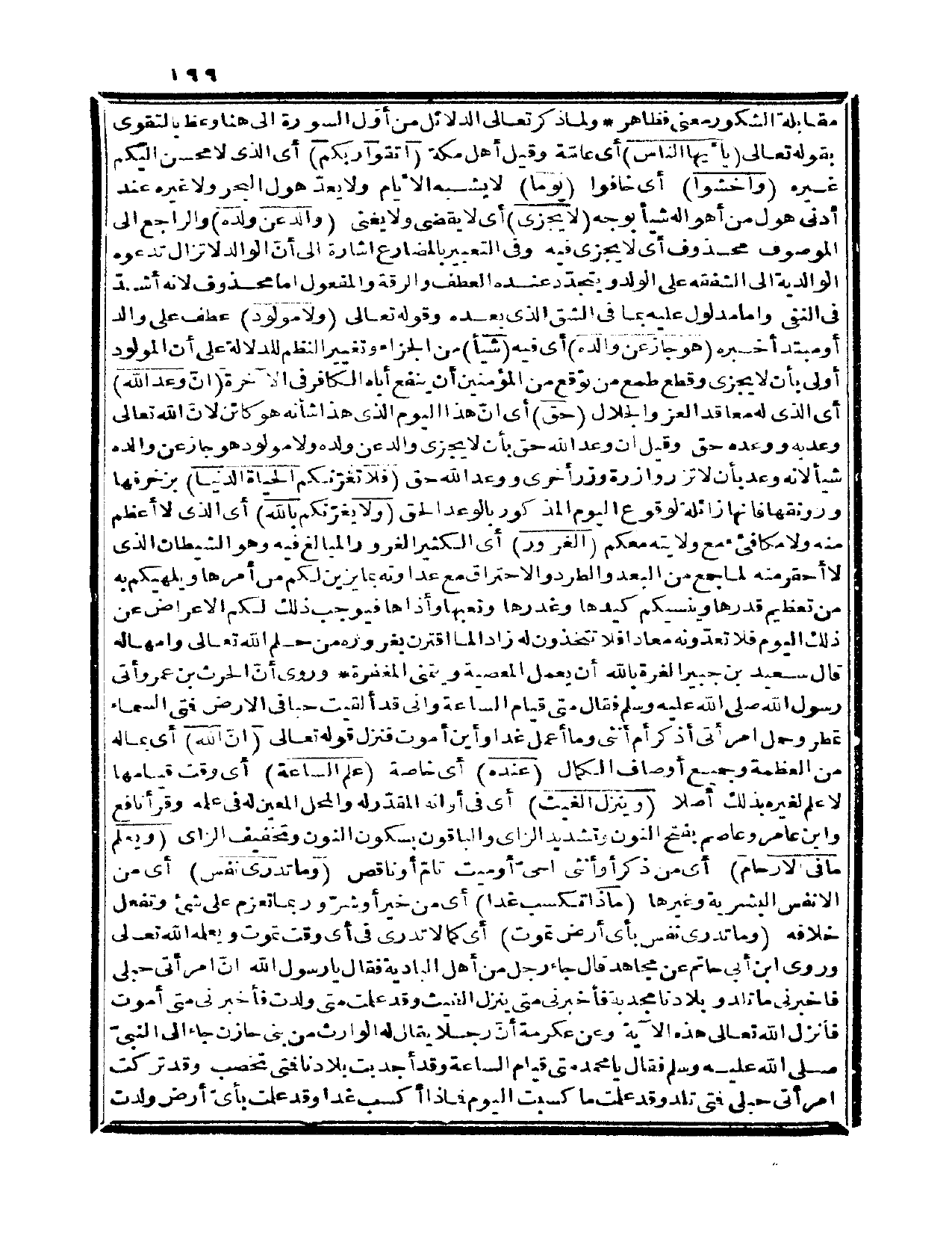 {يا أيها الناس} أي: عامّة. وقيل: أهل مكة {اتقوا ربكم} أي: الذي لا محسن إليكم غيره {واخشوا} أي: خافوا {يوماً} لا يشبه الأيام ولا يعدّ هول البحر ولا غيره عند أدنى هول من أهواله شيئاً بوجه {لا يجزي} أي: لا يقضي ولا يغني {والد عن ولده} والراجع إلى الموصوف محذوف أي: لا يجزي فيه. وفي التعبير بالمضارع إشارة إلى أنّ الوالد لا تزال تدعوه الوالدية إلى الشفقة على الولد ويتجدّد عنده العطف والرقة. والمفعول إما محذوف لأنه أشدّ في النفي وإما مدلول عليه بما في الشق الذي بعده. وقوله تعالى {ولا مولود} عطف على والد أو مبتدأ وخبره {هو جاز عن والده} أي: فيه {شيئاً} من الجزاء وتغيير النظم للدلالة على أن المولود أولى بأن لا يجزي، وقطع طمع من توقع من المؤمنين أن ينفع أباه الكافر في الآخرة {إنّ وعد الله} أي: الذي له معاقد العز والجلال {حق} أي: أنّ هذا اليوم الذي هذا شأنه هو كائن؛ لأنّ الله تعالى وعد به ووعده حق، وقيل: إنّ وعد الله حق بأن لا يجزي والد عن ولده ولا مولود هو جاز عن والده شيئاً لأنه وعد بأن لا تزر وازرة وزر أخرى ووعد الله حق {فلا تغرّنكم الحياة الدنيا} بزخرفها ورونقها فإنها زائلة لوقوع اليوم المذكور بالوعد الحق {ولا يغرّنكم بالله} أي: الذي لا أعظم منه ولا مكافئ مع ولايته معكم {الغرور} أي: الكثير الغرور المبالغ فيه وهو الشيطان الذي لا أحقر منه لما جمع من البعد والطرد والاحتراق مع عداوته بما يزين لكم من أمرها ويلهيكم به من تعظيم قدرها وينسيكم كيدها وغدرها وتعبها وأذاها فيوجب ذلك لكم الإعراض عن ذلك اليوم فلا تعدّونه معاداً فلا تتخذون له زاد لما اقترن بغروره من حلم الله تعالى وإمهاله، قال سعيد بن جبير: الغرة بالله أن يعمل المعصية ويتمنى المغفرة، وروي أنّ الحارث بن عمرو أتى رسول الله صلى الله عليه وسلم فقال متى قيام الساعة وإني قد ألقيت حباً في الأرض فمتى السماء تمطر، وحمل امرأتي أذكر أم