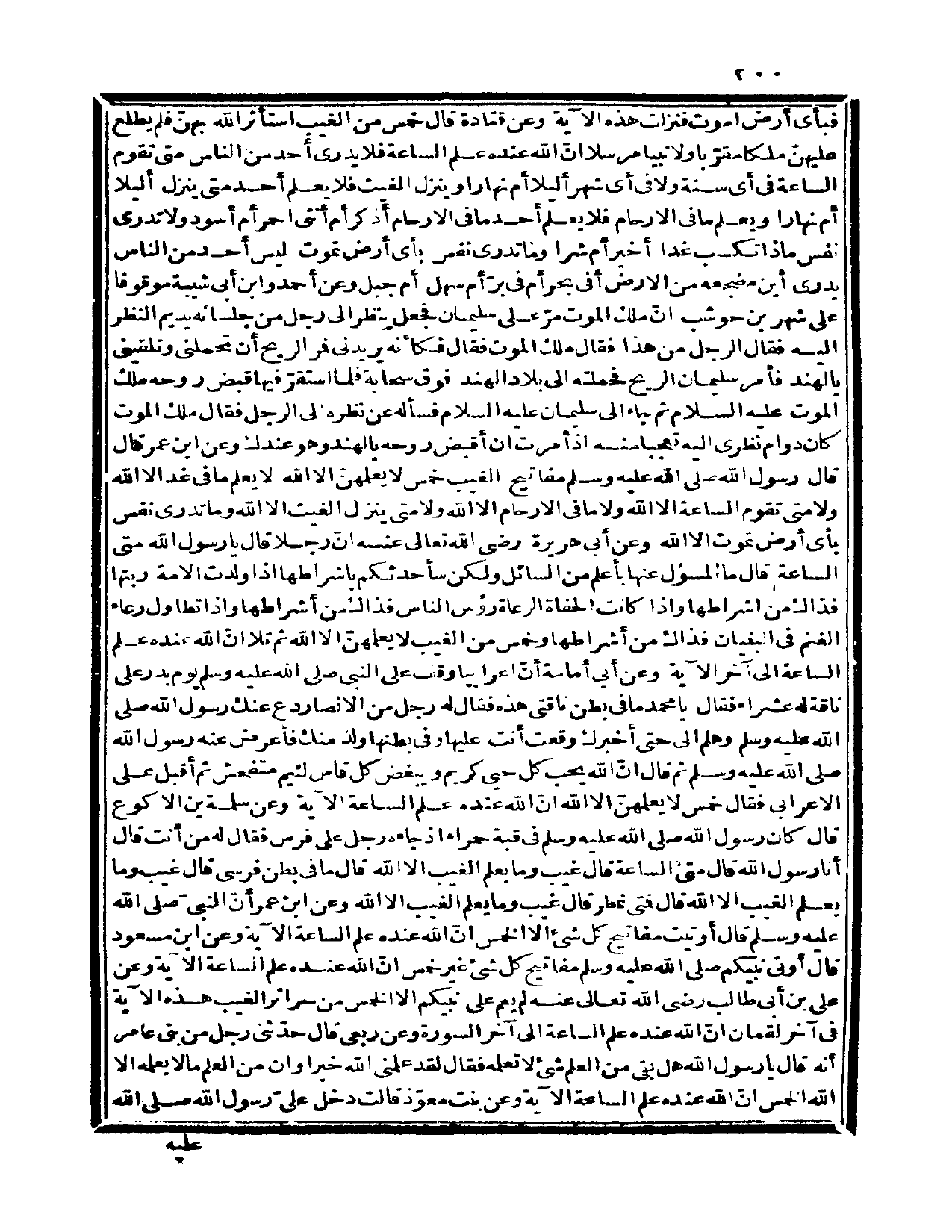 وعن ابن مسعود قال أوتي نبيكم صلى الله عليه وسلم مفاتيح كل شيء غير خمس: إنّ الله عنده علم الساعة الآية، وعن علي بن أبي طالب رضي الله تعالى عنه لم يعم على نبيكم إلا الخمس من سرائر الغيب هذه الآية في آخر لقمان: إنّ الله عنده علم الساعة إلى آخر السورة، وعن ربعي قال حدّثني رجل من بني عامر أنه قال: يا رسول الله هل بقي من العلم شيء لا تعلمه؟ فقال: «لقد علمني الله خيراً وإن من العلم ما لا يعلمه إلا الله الخمس إن الله عنده علم الساعة الآية» .