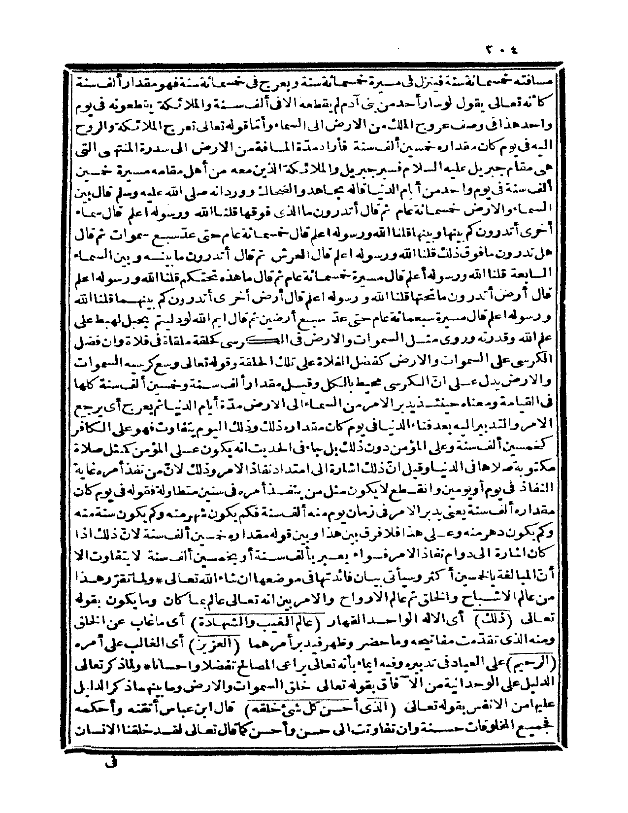 مسافته خمسمائة سنة، فينزل في مسيرة خمسمائة سنة، ويعرج في خمسمائة سنة فهو مقدار ألف سنة كأنه تعالى يقول: لو سار أحد من بني آدم لم يقطعه إلا في ألف سنة، والملائكة يقطعونه في يوم واحد، هذا في وصف عروج الملك من الأرض إلى السماء، وأما قوله تعالى: {تعرج الملائكة والروح إليه في يوم كان مقداره خمسين ألف سنة} فأراد مدة المسافة من الأرض إلى سدرة المنتهى التي هي مقام جبريل، عليه السلام فسير جبريل والملائكة الذين معه من أهل مقامه مسيرة خمسين ألف سنة في يوم واحد من أيام الدنيا. قاله مجاهد والضحاك، وورد أنه صلى الله عليه وسلم قال: «بين السماء والأرض خمسمائة عام ثم قال: أتدرون ما الذي فوقها؟ قلنا: الله ورسوله أعلم قال: سماء أخرى أتدرون كم بينها وبينها؟ قلنا: الله ورسوله أعلم قال: خمسمائة عام حتى عد سبع سموات ثم قال: هل تدرون ما فوق ذلك؟ قلنا: الله ورسوله أعلم قال: العرش ثم قال: أتدرون ما بينه وبين السماء السابعة؟ قلنا: الله ورسوله أعلم قال مسيرة خمسمائة عام، ثم قال: ما هذه تحتكم؟ قلنا: الله ورسوله أعلم قال: أرض، أتدرون ما تحتها؟ قلنا: الله ورسوله أعلم قال: أرض أخرى أتدرون كم بينها؟ قلنا: الله ورسوله أعلم قال: مسيرة سبعمائة عام، حتى عد سبع أرضين ثم قال: أيمُ الله لو دليتم بحبل لهبط على علم الله وقدرته» وروي: «مَثَلُ السموات والأرض في الكرسي كحلقة ملقاة في فلاة، وإن فضل الكرسي على السموات والأرض كفضل الفلاة على تلك الحلقة» .