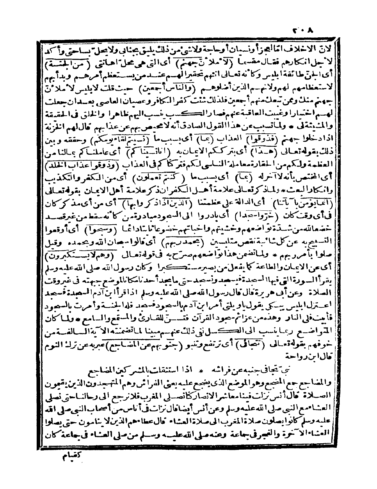 والمضاجع: جمع المضجع وهو الموضع الذي يضجع عليه يعني الفراش وهم المتهجدون الذين يقيمون الصلاة. قال أنس: «نزلت فينا معاشر الأنصار كنا نصلي المغرب فلا نرجع إلى رحالنا حتى نصلي العشاء مع النبي صلى الله عليه وسلم وعن أنس أيضاً قال: «نزلت في أناس من أصحاب النبي صلى الله عليه وسلم كانوا يصلون صلاة المغرب إلى صلاة العشاء» قال عطاء: هم الذين لا ينامون حتى يصلوا العشاء الآخرة والفجر في جماعة.