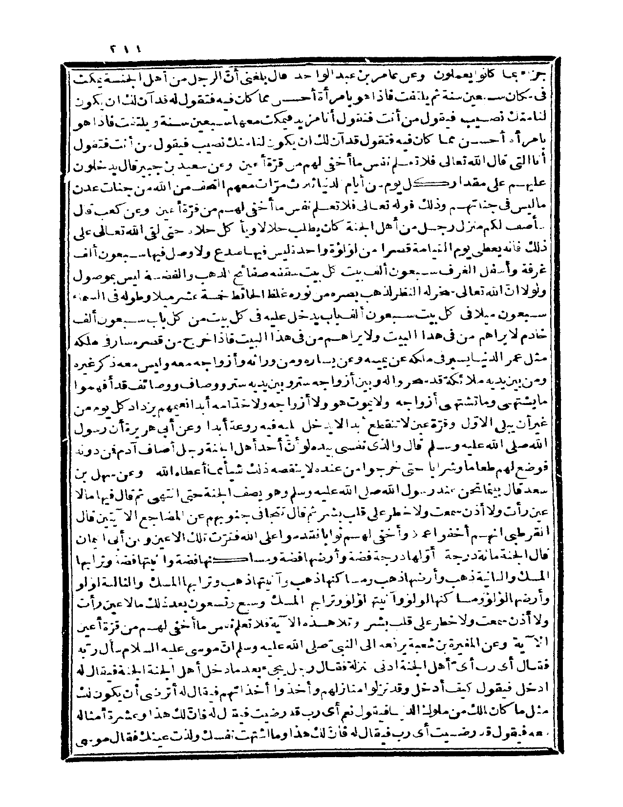 وعن سعيد بن جبير قال: يدخلون عليهم على مقدار كل يوم من أيام الدنيا ثلاث مرات معهم التحف من الله من جنات عدن ما ليس في جناتهم، وذلك قوله تعالى: {فلا تعلم نفس ما أخفي لهم من قرة أعين} وعن كعب قال: سأصف لكم منزل رجل من أهل الجنة كان يطلب حلالاً ويأكل حلالاً حتى لقي الله تعالى على ذلك، فإنه يعطى يوم القيامة قصراً من لؤلؤة واحدة ليس فيها صدع ولا وصل، فيها سبعون ألف غرفة، وأسفل الغرف سبعون ألف بيت كل بيت سقفه صفائح الذهب والفضة ليس بموصول، ولولا أن الله تعالى سخر النظر لذهب بصره من نوره غلظ الحائط خمس عشر ميلاً وطوله في السماء سبعون ميلاً، في كل بيت سبعون ألف باب يدخل عليه في كل بيت من كل باب سبعون ألف خادم لا يراهم من في هذا البيت ولا يراهم من في هذا البيت، فإذا خرج من قصره سار في ملكه مثل عمر الدنيا يسير في ملكه عن يمينه وعن يساره ومن ورائه، وأزواجه معه وليس معه ذكر غيره ومن بين يديه ملائكة قد سخروا له وبين أزواجه ستر، وبين يديه ستر ووصاف ووصائف قد أفهموا ما يشتهي وما تشتهي أزواجه، ولا يموت هو ولا أزواجه ولا خدّامه أبداً، نعيمهم يزداد كل يوم من غير أن يبلي الأول، وقرة عين لا تنقطع أبداً، لا يدخل عليه فيه روعة أبداً.