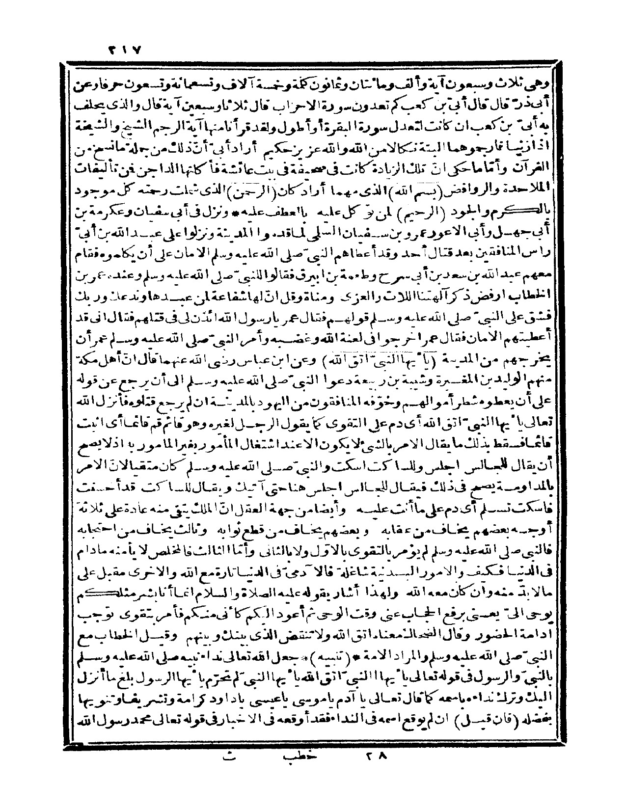 وعن أبي ذر قال: قال أبيّ بن كعب: كم تعدون سورة الأحزاب قال: ثلاثاً وسبعين آية قال: والذي يحلف به أبيّ بن كعب أن كانت لتعدل سورة البقرة أو أطول، ولقد قرأنا منها آية الرجم الشيخ والشيخة إذا زنيا فارجموهما البتة نكالاً من الله والله عزيز حكيم أراد أبيّ أن ذلك من جملة ما نسخ من القرآن وأما ما حكي أن تلك الزيادة كانت في صحيفة في بيت عائشة فأكلتها الداجن فمن تأليفات الملاحدة والروافض.