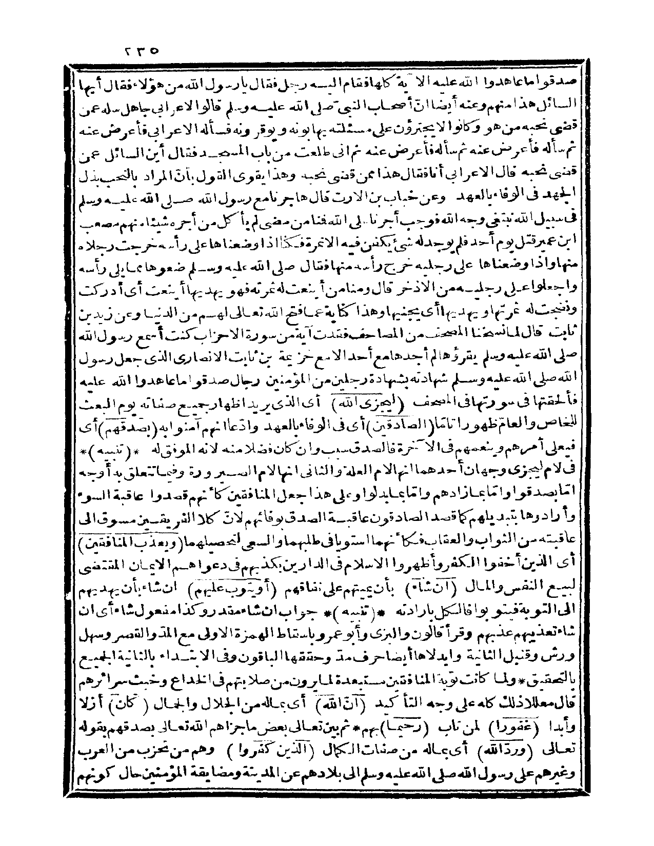 صدقوا وما عاهدوا الله عليه} الآية كلها فقام إليه رجل فقال: يا رسول الله من هؤلاء فقال: «أيها السائل هذا منهم» ، وعنه أيضاً: أن أصحاب النبي صلى الله عليه وسلم قالوا لأعرابي جاهل: سله عمن قضى نحبه من هو؟ كانوا لا يجترؤن على مسألته يهابونه ويوقرونه، فسأله الأعرابي فأعرض عنه، ثم سأله فأعرض عنه، ثم سأله فأعرض عنه، ثم إني طلعت من باب المسجد فقال: أين السائل عمن قضى نحبه؟ قال الأعرابي: أنا فقال: «هذا ممن قضى نحبه» ، وهذا يقوي القول بأن المراد بالنحب بذل الجهد في الوفاء بالعهد، وعن خباب بن الأرت قال: هاجرنا مع رسول الله صلى الله عليه وسلم في سبيل الله نبتغي وجه الله فوجب أجرنا على الله، فمنا من مضى لم يأكل من أجره شيئاً، منهم مصعب بن عمير قتل يوم أحد فلم يوجد له شيء يكفن فيه إلا نمرة، فكنا إذا وضعناها على رأسه خرجت رجلاه منها، وإذا وضعناها على رجليه خرج رأسه منها فقال صلى الله عليه وسلم «ضعوها مما يلي رأسه واجعلوا على رجليه من الأذخر» قال: ومنا من أينعت له ثمرته فهو يهديها أينعت أي: أدركت ونضجت له ثمرتها ويهديها أي: يجنيها، وهذا كناية عما فتح الله تعالى لهم من الدنيا وعن زيد بن ثابت قال: