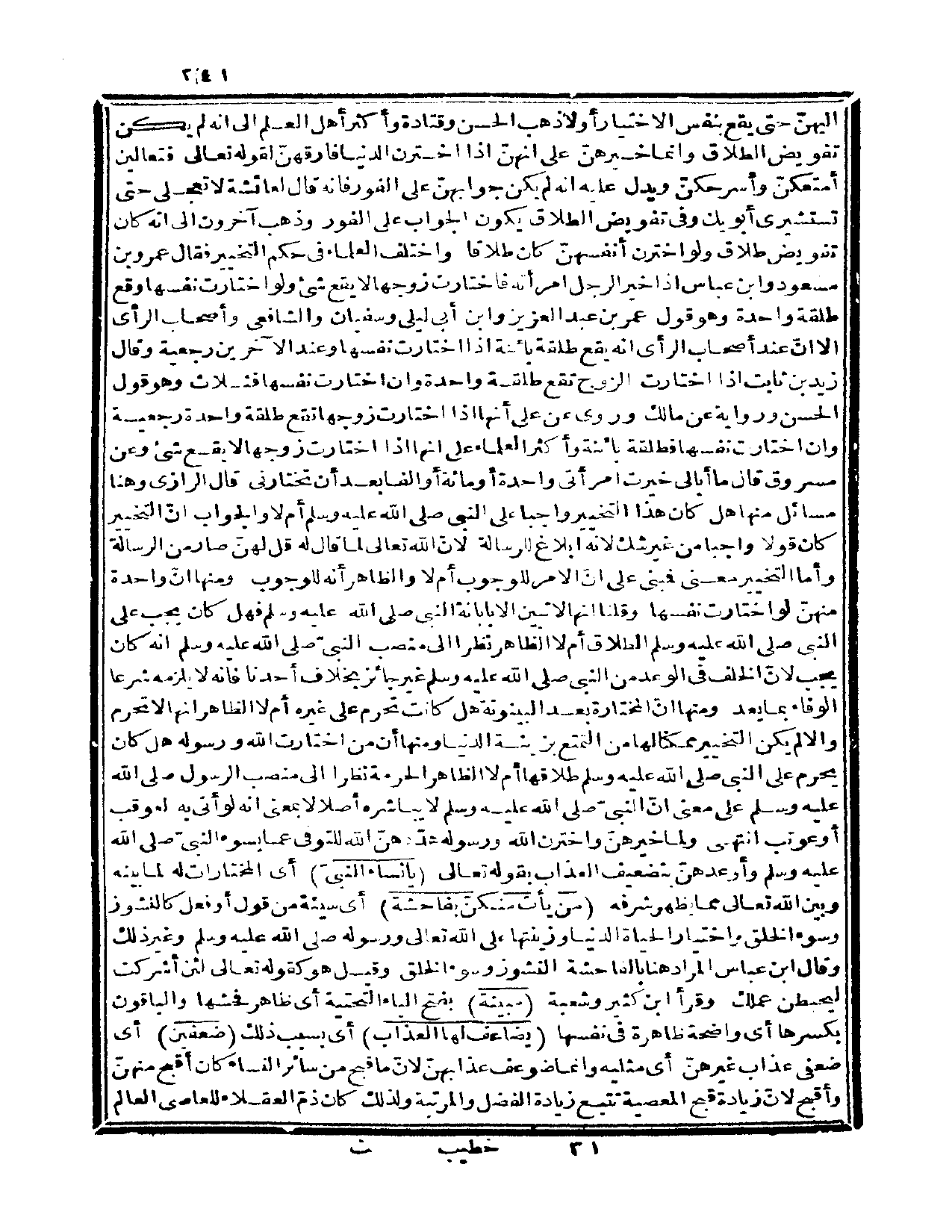 إليهن حتى يقع بنفس الاختيار أو لا، ذهب الحسن وقتادة وأكثر أهل العلم: إلى أنه لم يكن تفويض الطلاق، وإنما خيرهن على أنهن إذا اخترن الدنيا فارقهن لقوله تعالى: {فتعالين أمتعكن وأسرحكن} ويدل عليه أنه لم يكن جوابهن على الفور فإنه قال لعائشة: لا تعجلي حتى تستشيري أبويك، وفي تفويض الطلاق يكون الجواب على الفور، وذهب آخرون: إلى أنه كان تفويض طلاق، ولو اخترن أنفسهن كان طلاقاً.