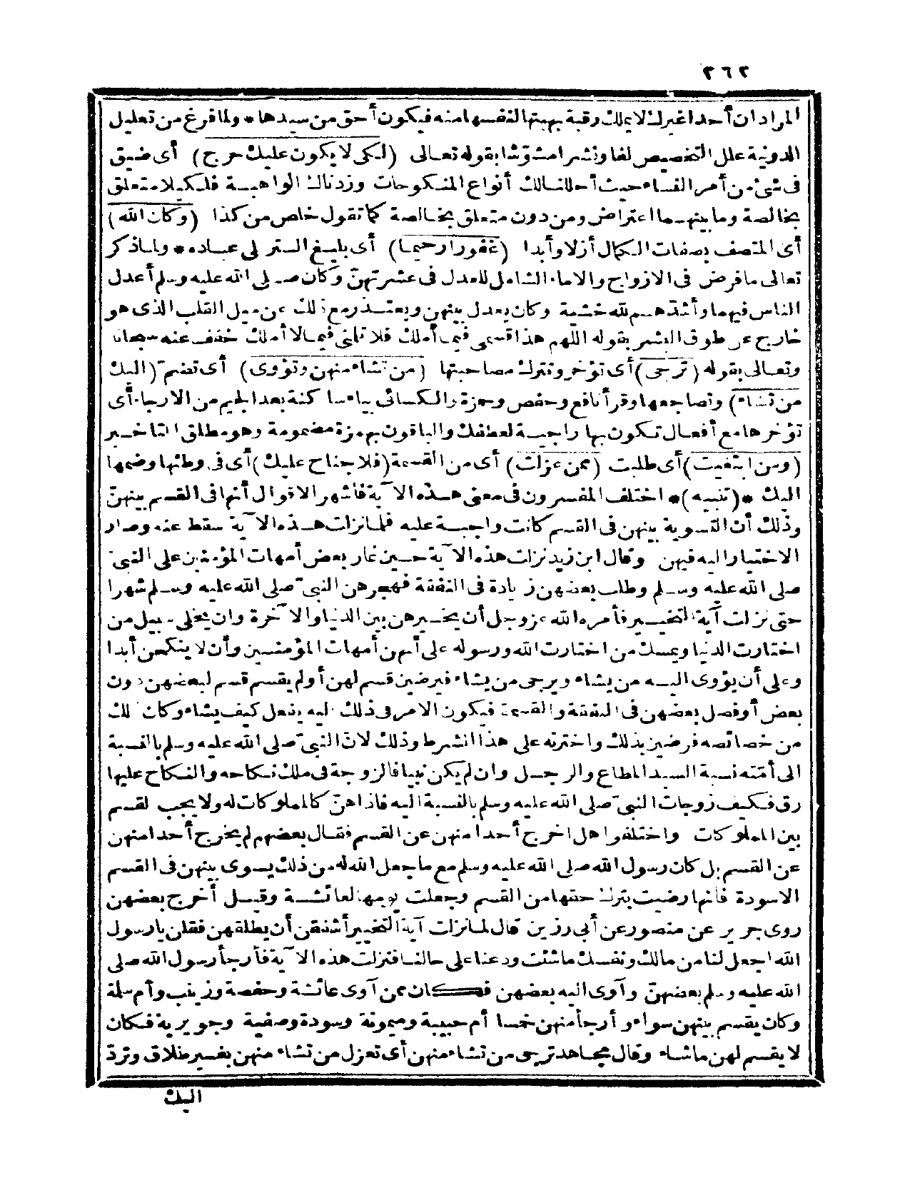 تنبيه: اختلف المفسرون في معنى هذه الآية: فأشهر الأقوال أنها في القسم بينهن، وذلك أن التسوية بينهن في القسم كانت واجبة عليه، فلما نزلت هذه الآية سقط عنه وصار الاختيار إليه فيهن. وقال ابن زيد: نزلت هذه الآية حين غار بعض أمهات المؤمنين على النبي صلى الله عليه وسلم وطلب بعضهن زيادة في النفقة فهجرهن النبي صلى الله عليه وسلم شهراً حتى نزلت آية التخيير، فأمره الله عز وجل أن يخيرهن بين الدنيا والآخرة وأن يخلي سبيل من اختارت الدنيا، ويمسك من اختارت الله ورسوله على أنهن أمهات المؤمنين، وأن لا ينكحن أبداً، وعلى أن يؤوي إليه من يشاء ويرجي من يشاء فيرضين، قسم لهن أو لم يقسم قسم، لبعضهن دون بعض، أو فضل بعضهن في النفقة والقسمة فيكون الأمر في ذلك إليه يفعل كيف يشاء، وكان ذلك من خصائصه فرضين بذلك واخترنه على هذا الشرط، وذلك؛ لأن النبي صلى الله عليه وسلم بالنسبة إلى أمته نسبة السيد المطاع. والرجل وإن لم يكن نبياً فالزوجة في ملك نكاحه، والنكاح عليها رق، فكيف زوجات النبي صلى الله عليه وسلم بالنسبة إليه، فإذا هن كالمملوكات له ولا يجب لقسم بين المملوكات.