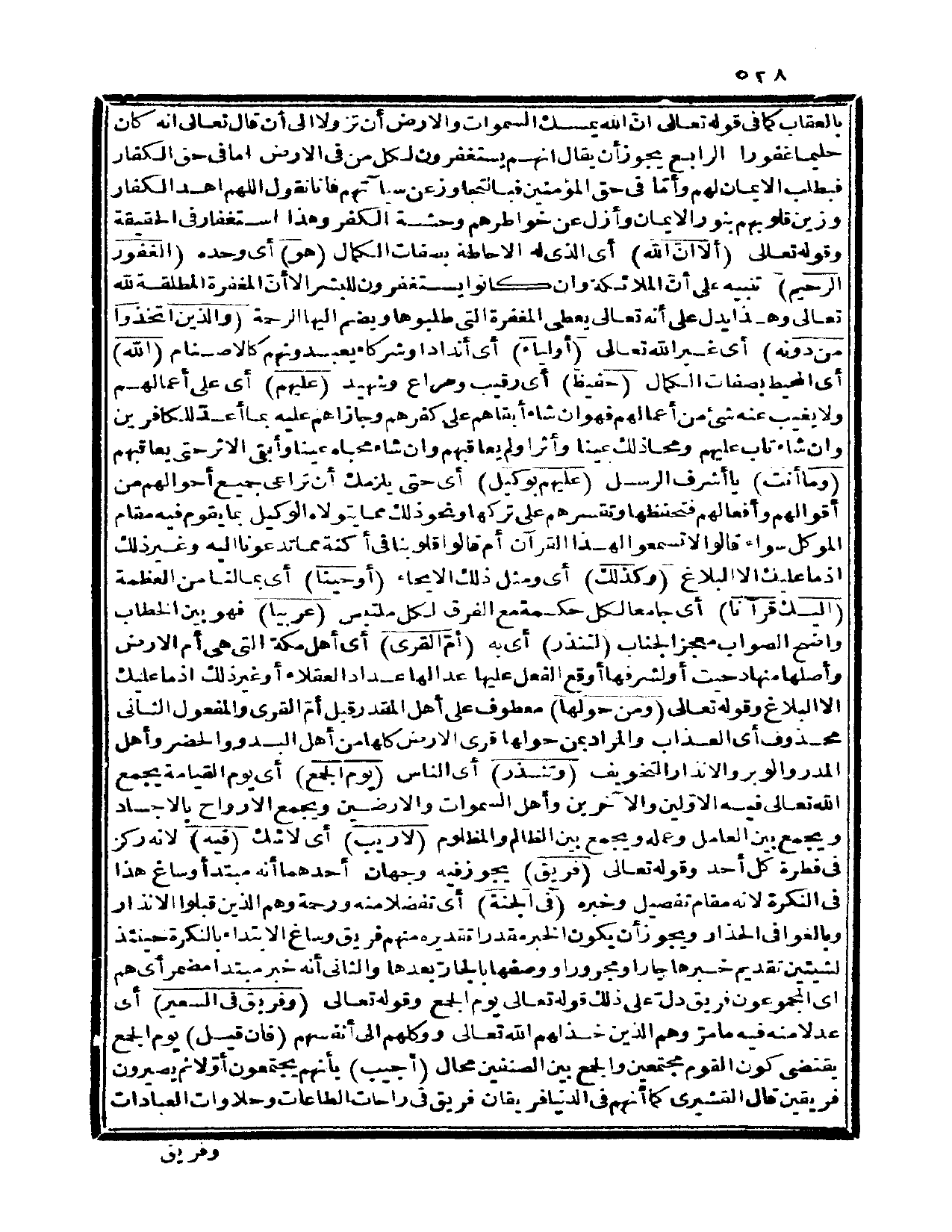 {وكذلك} أي: ومثل ذلك الإيحاء {أوحينا} أي: بما لنا من العظمة {إليك قرآناً} أي: جامعاً لكل حكمة مع الفرق لكل ملتبس {عربياً} فهو بين الخطاب واضح الصواب معجز الجناب {لتنذر} أي: به {أم القرى} أي: أهل مكة التي هي أم الأرض وأصلها منها دحيت، أو لشرفها أوقع الفعل عليها عداً لها عداد العقلاء أو غير ذلك إذ ما عليك إلا البلاغ، وقوله تعالى {ومن حولها} معطوف على أهل المقدر قبل أم القرى، والمفعول الثاني محذوف أي: العذاب والمراد بمن حولها: قرى الأرض كلها من أهل البدو والحضر وأهل المدر والوبر، والإنذار: التخويف {وتنذر} أي: الناس.