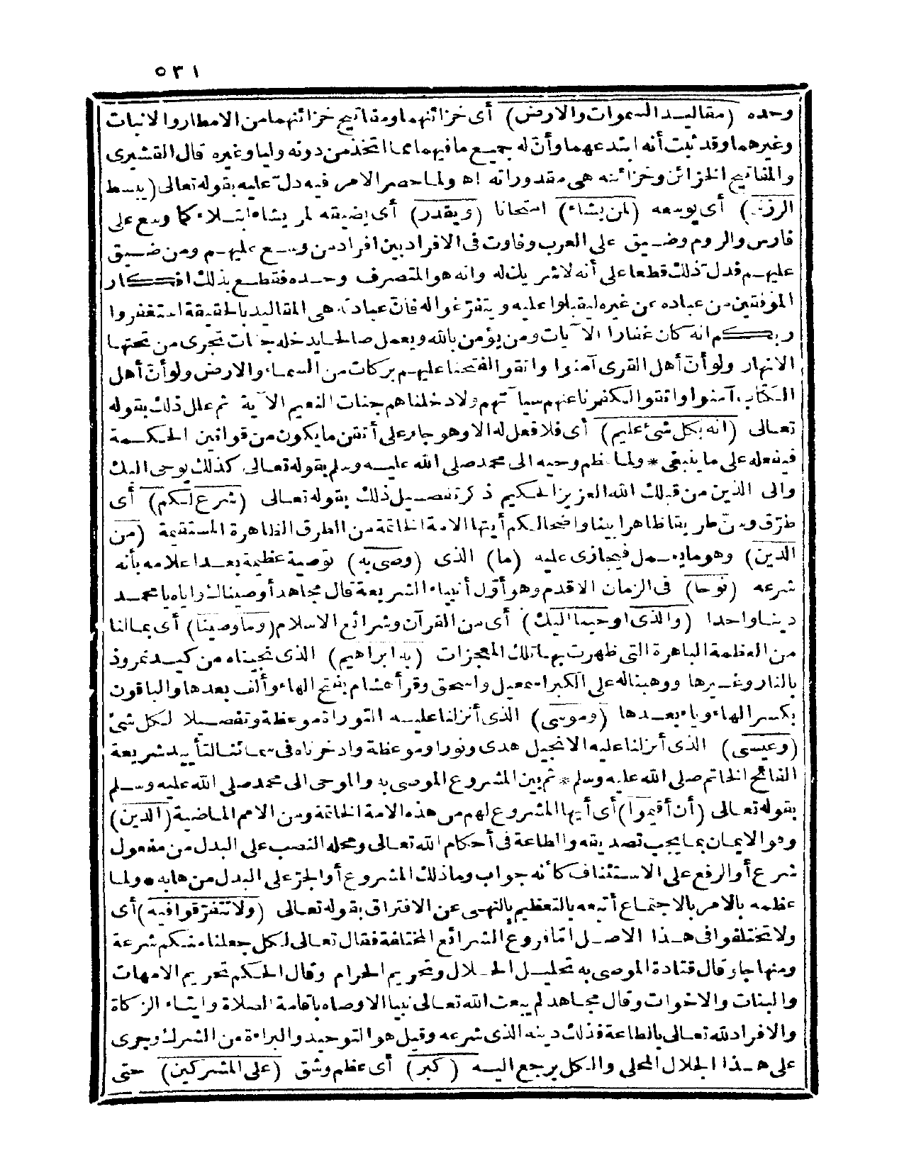 {شرع لكم} أي: طرّق وسنّ طريقاً ظاهراً بيناً واضحاً لكم أيتها الأمة الخاتمة من الطرق الظاهرة المستقيمة {من الدين} وهو ما يعمل فيجازى عليه {ما} الذي {وصى به} توصية عظيمة بعد إعلامه بأنه شرعه {نوحاً} في الزمان الأقدم وهو أول أنبياء الشريعة، قال مجاهد: أوصيناك وإياه يا محمد ديناً واحداً {والذي أوحينا إليك} أي: من القرآن وشرائع الإسلام {وما وصينا} أي: بما لنا من العظمة الباهرة التي ظهرت بها تلك المعجزات {به إبراهيم} الذي نجيناه من كيد نمروذ بالنار وغيرها ووهبنا له على الكبر إسماعيل وإسحاق، وقرأ هشام بفتح الهاء وألف بعدها، والباقون بكسر الهاء وياء بعدها {وموسى} الذي أنزلنا عليه التوراة موعظة وتفصيلاً لكل شيء {وعيسى} الذي أنزلنا عليه الإنجيل هدى ونوراً وموعظة، وادخرناه في سمائنا لتأييد شريعة الفاتح الخاتم صلى الله عليه وسلم