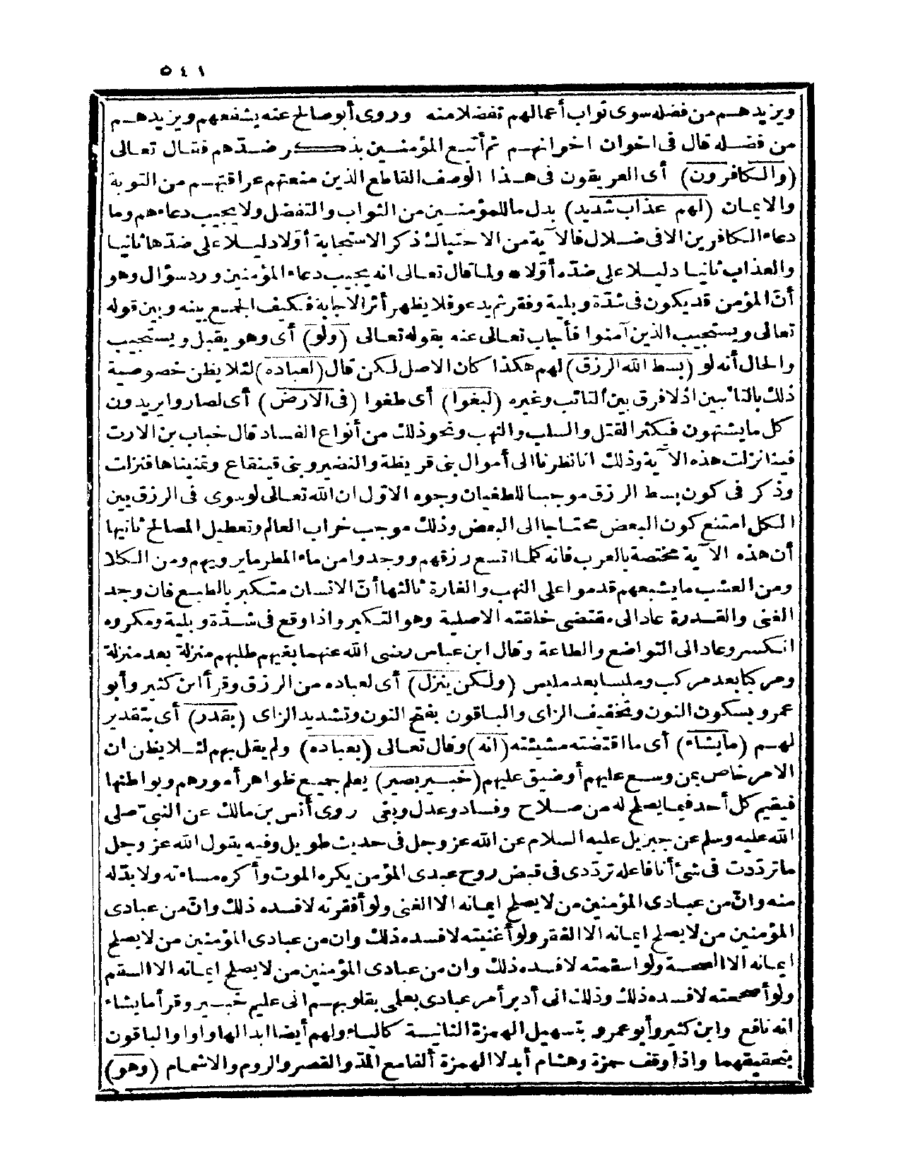 {ولو} أي: وهو يقبل ويستجيب والحال أنه لو {بسط الرزق} لهم هكذا كان الأصل لكن قال: {لعباده} لئلا يظن خصوصية ذلك بالتائبين إذ لا فرق بين التائب وغيره {لبغوا} أي: طغوا {في الأرض} أي: لصاروا يريدون كل ما يشتهون فيكثر القتل والسلب والنهب ونحو ذلك من أنواع الفساد، قال خباب بن الأرت: فينا نزلت هذه الآية وذلك إنا نظرنا إلى أموال بني قريظة والنضير وبني قينقاع وتمنيناها فنزلت، وذكر في كون بسط الرزق موجباً للطغيان وجوه: الأول: أن الله تعالى لو سوى في الرزق بين الكل امتنع كون البعض محتاجاً إلى البعض وذلك موجب خراب العالم وتعطيل المصالح، ثانيها: أن هذه الآية مختصة بالعرب فإنه كلما اتسع رزقهم ووجدوا من ماء المطر ما يرويهم ومن الكلأ ومن العشب ما يشبعهم قدموا على النهب والغارة، ثالثها: أن الإنسان متكبر بالطبع فإن وجد الغنى والقدرة عاد إلى مقتضى خلقته الأصلية وهو التكبر وإذا وقع في شدة وبلية ومكروه انكسر وعاد إلى التواضع والطاعة، وقال ابن عباس رضي الله عنهما: «بغيهم طلبهم منزلة بعد منزلة ومركباً بعد مركب وملبساً بعد ملبس» {ولكن ينزل} أي: لعباده من الرزق، وقرأ ابن كثير وأبو عمرو: بسكون النون وتخفيف الزاي والباقون بفتح النون وتشديد الزاي {بقدر} أي: بتقدير لهم {ما يشاء} أي: ما اقتضته مشيأته {أنه} وقال تعالى: {بعباده} ولم يقل بهم لئلا يظن أن الأمر خاص بمن وسع عليهم أو ضيق عليهم {خبير بصير} يعلم جميع ظواهر أمورهم وبواطنها فيقيم كل أحد فيما يصلح له من صلاح وفساد وعدل وبغي.
