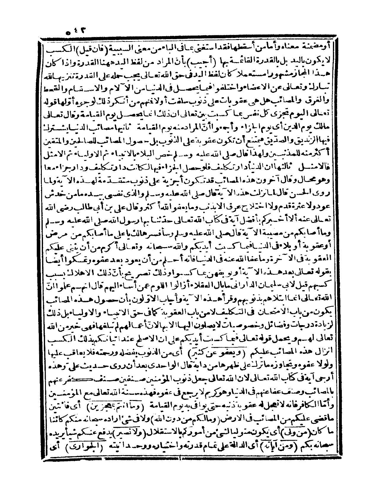 أو مضمنة معناه وأما من أسقطها فقد استغنى بما في الباء من معنى السببية، فإن قيل: الكسب لا يكون باليد بل بالقدرة القائمة بها؟ أجيب: بأن المراد من لفظ اليد هنا القدرة وإذا كان هذا المجاز مشهوراً مستعملاً كان لفظ اليد في حق الله تعالى يجب حمله على القدرة تنزيهاً لله تبارك وتعالى عن الأعضاء، واختلفوا فيما يحصل في الدنيا من الآلام والأسقام والقحط والغرق والمصائب هل هي عقوبات على ذنوب سلفت أولاً، فمنهم من أنكر ذلك لوجوه أولها قوله تعالى: {اليوم تجزى كل نفس بما كسبت} (غافر: 17)