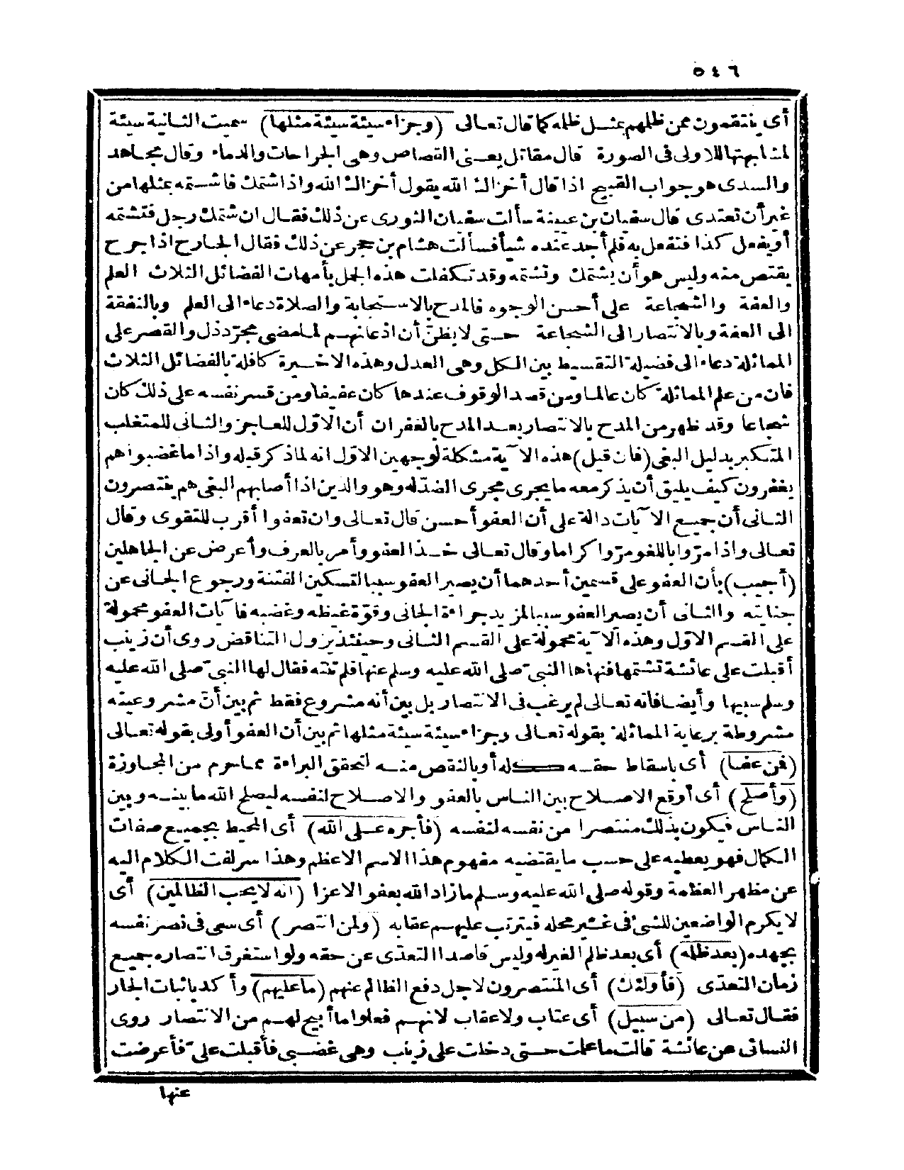 {وجزاء سيئة سيئة مثلها} سميت الثانية سيئة لمشابهتها للأولى في الصورة قال مقاتل: يعني القصاص وهي الجراحات والدماء، وقال مجاهد والسدي: هو جواب القبيح إذا قال: أخزاك الله يقول: أخزاك الله وإذا شتمك فاشتمه بمثلها من غير أن تعتدي، قال سفيان بن عيينة: سألت سفيان الثوري عن ذلك فقال: إن شتمك رجل فتشتمه أو يفعل كذا فتفعل به فلم أجد عنده شيئاً، فسأل هشام بن حجر عن ذلك فقال: الجارح إذا جرح يقتص منه وليس هو أن يشتمك وتشتمه وقد تكفلت هذه الجمل بأمهات الفضائل الثلاث، العلم والعفة والشجاعة على أحسن الوجوه، فالمدح بالاستجابة والصلاة دعاء إلى العلم وبالنفقة إلى العفة وبالانتصار إلى الشجاعة حتى لا يظن أن إذعانهم لما مضى مجرد ذل، والقصر على المماثلة دعاء إلى فضيلة التقسيط بين الكل وهي العدل، وهذه الأخيرة كافلة بالفضائل الثلاث فإن من علم المماثلة كان عالماً، ومن قصد الوقوف عندها كان عفيفاً ومن قسر نفسه على ذلك كان شجاعاً وقد ظهر من المدح بالانتصار بعد المدح بالغفران أن الأول: للعاجز، والثاني: للمتغلب المتكبر بدليل البغي، فإن قيل: هذه الآية مشكلة لوجهين؛ الأول: أنه لما ذكر قبله {وإذا ما غضبوا هم يغفرون} ، كيف يليق أن يذكر معه ما يجري مجرى الضد له وهو {الذين إذا أصابهم البغي هم ينتصرون} ، الثاني: أن جميع الآيات دالة على أن العفو أحسن، قال تعالى: {وأن تعفوا أقرب للتقوى} (البقرة: 237)