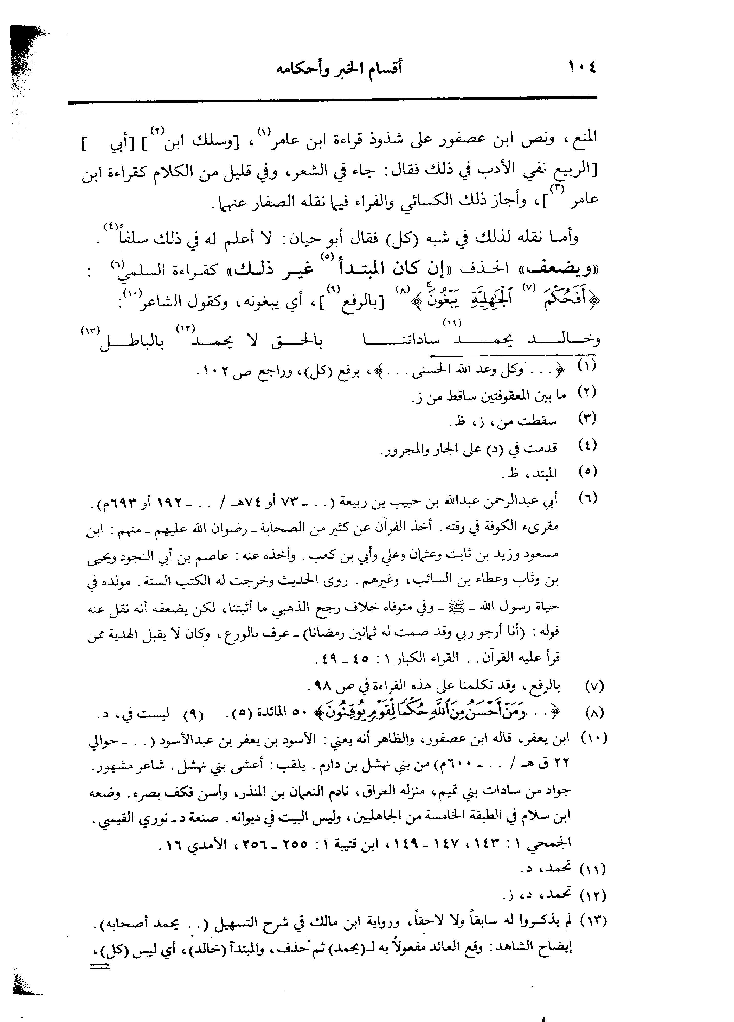 وأما نقله لذلك في شبه (كل) فقال أبو حيان: لا أعلم له في ذلك سلفًا «ويضعف» الحذف «إن كان المبتدأ غير ذلك» كقراءة السلمي: {أفحكم الجاهلين يبغون} [بالرفع]، أي يبغونه، وكقول الشاعر: