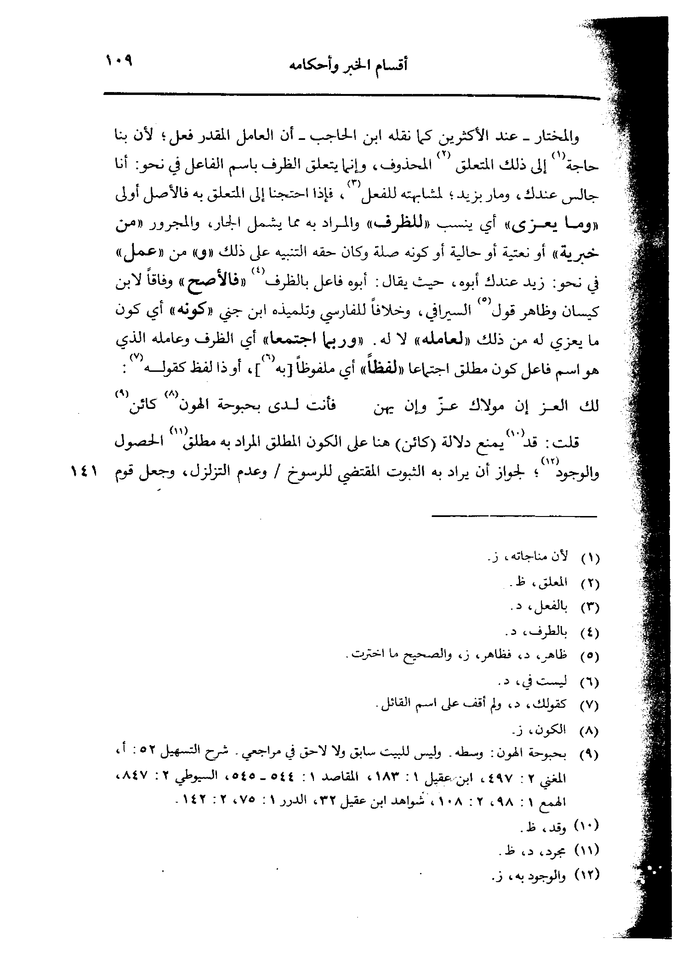 والمختار - عند الأكثرين كما نقله ابن الحاجب - أن العامل المقدر فعل؛ لأن بنا حاجة إلى ذلك المتعلق المحذوف، وإنما يتعلق الظرف باسم الفاعل في نحو: أنا جالس عندك، ومار بزيد؛ لمشابهته للفعل، فإذا احتجنا إلى المتعلق بع فالأصل أولى «وما يعزى» أي نسب «للظرف» والمراد به مما يشمل الجار، والمجرور «من خبرية» أو نعتيه أو حالية أو كونه صلة وكان حقه التنبيه على ذلك «و» من «عمل» في نحو: زيد عندك أبوه، حيث يقال: أبوه فاعل بالظرف «فالأصح» وفاقًا لابن كيسان وظاهر قول السيرافي، وخلافًا للفارسي وتلميذه ابن جني «كونه» أي كون ما يعزي له من ذلك «لعامله» لا له. «وربما اجتمعا» أي الظرف وعامله الذي هو اسم فاعل كون مطلق اجتماعا «لفظًا» أي ملفوظًا [به]، أو ذا لفظ كقوله: