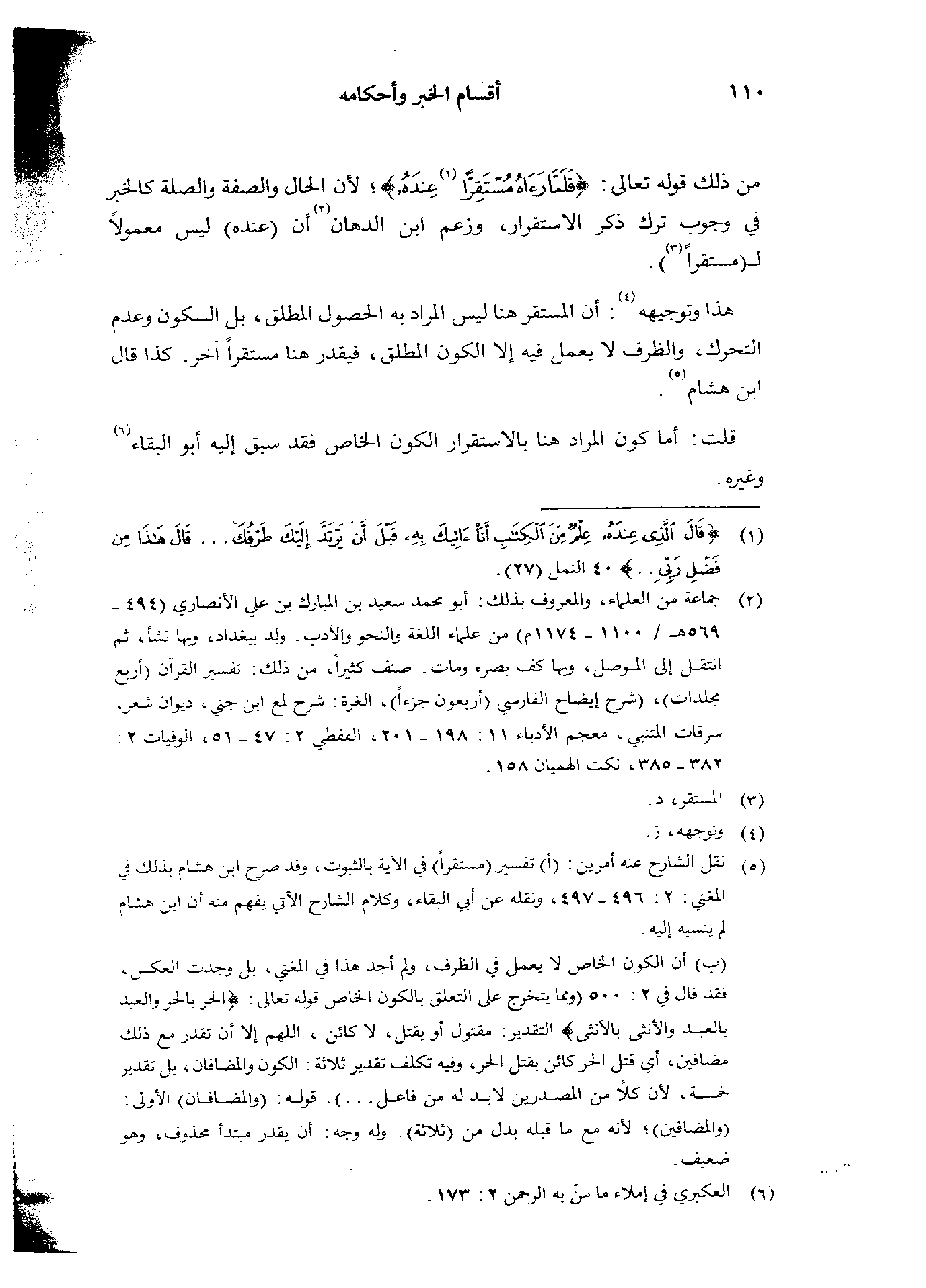 من ذلك قوله تعالى: {فلما رءاه مستقرا عنده}؛ لأن الحال والصفة والصلة كالخبر في وجوب ترك ذكر الاستقرار، وزعم ابن الدهان أن (عنده) ليس معمولًا ل (مستقرًا).