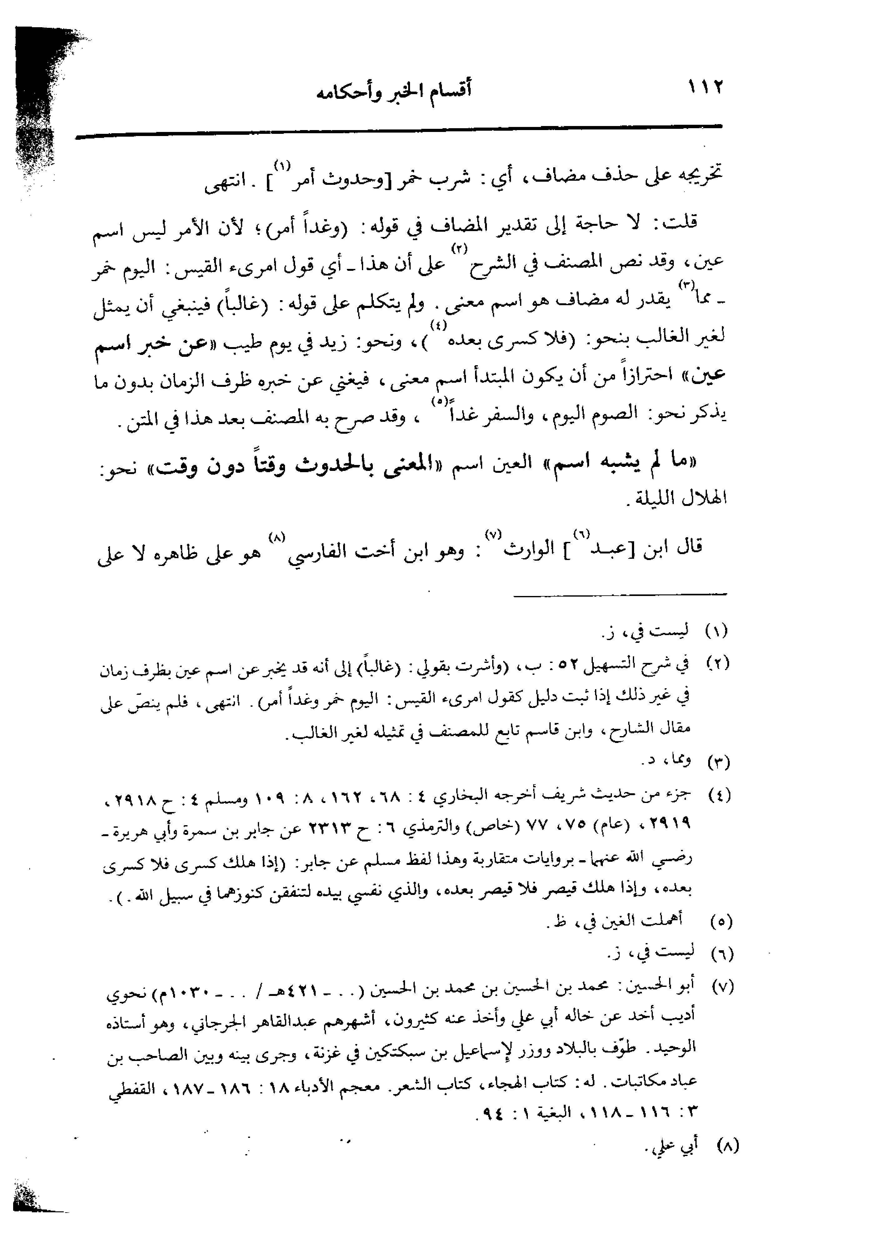 تخريجه على حذف مضاف، أي: شرب خمر [وغدًا أمر)؛ لأن الأمر ليس اسم عين، وقد نص المصنف في الشرح على أن هذا - أي قول امرئ القيس: اليوم خمر - مما يقدر له مضاف هو اسم معنى. ولم يتكلم على قوله: (غالبًا) فينبغي أن يمثل لغير الغالب بنحو: (فلا كسرى بعده)، ونحو: زيد في يوم طيب «المعنى بالحدوث وقتًا دون وقت» نحو: الهلال الليلة.
