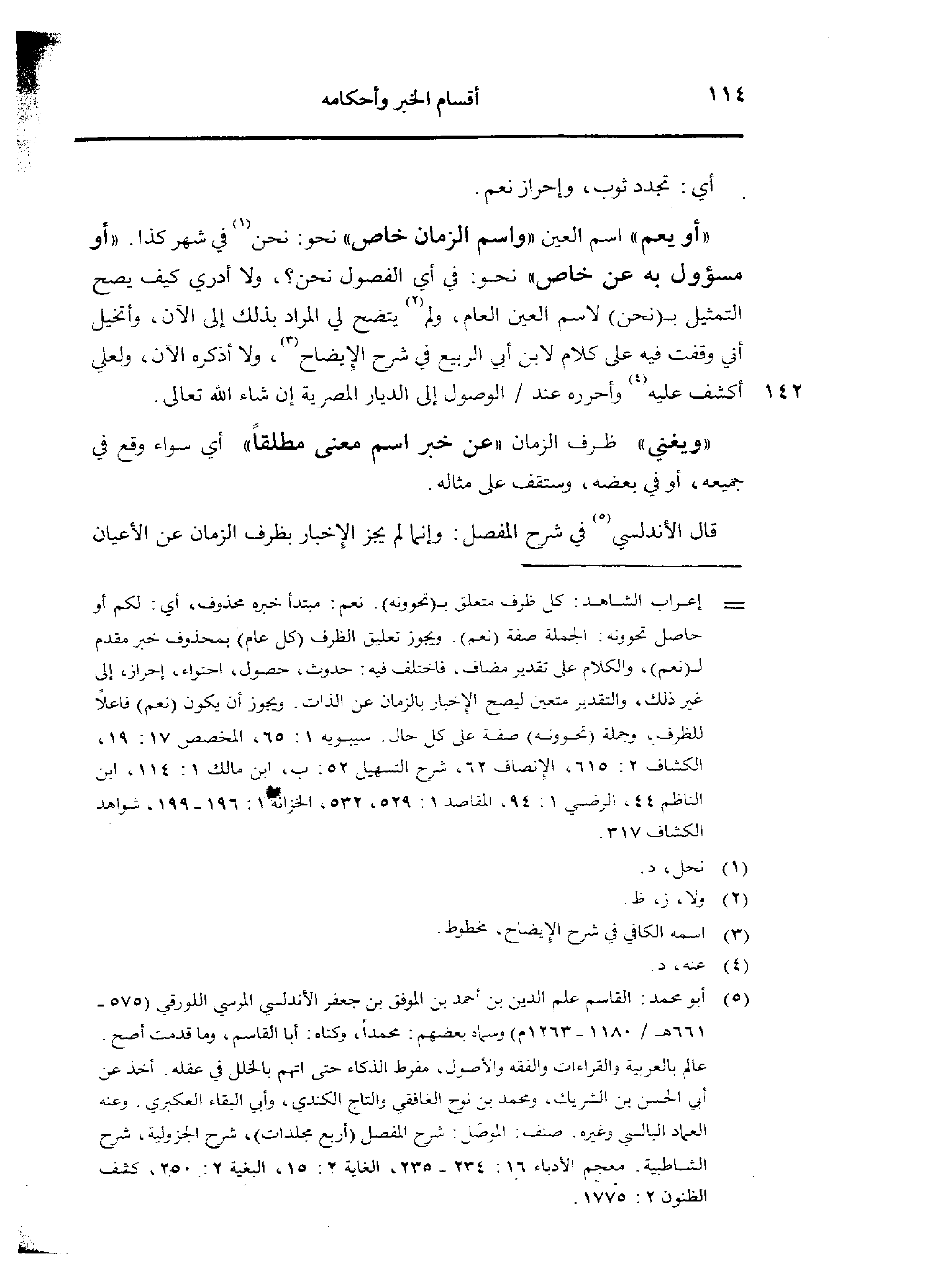 «أو يعم» اسم العين «واسم الزمان خاص» نحو: نحن في شهر كذا. «أو مسؤول به عن خاص» نحو: في أي الفصول نحن؟ ، ولا أدري كيف يصح التمثيل بـ ـ ـ (نحن) لاسم العين العام، ولم يتضح لي المراد بذلك إلى الآن، وأتخيل أني وقفت فيه على كلام لابن أبي الربيع في شرح الإيضاح، ولا أذكره الآن، ولعلي أكشف عليه وأحرره عند/ الوصول إلى الديار المصرية إن شاء الله تعالى.