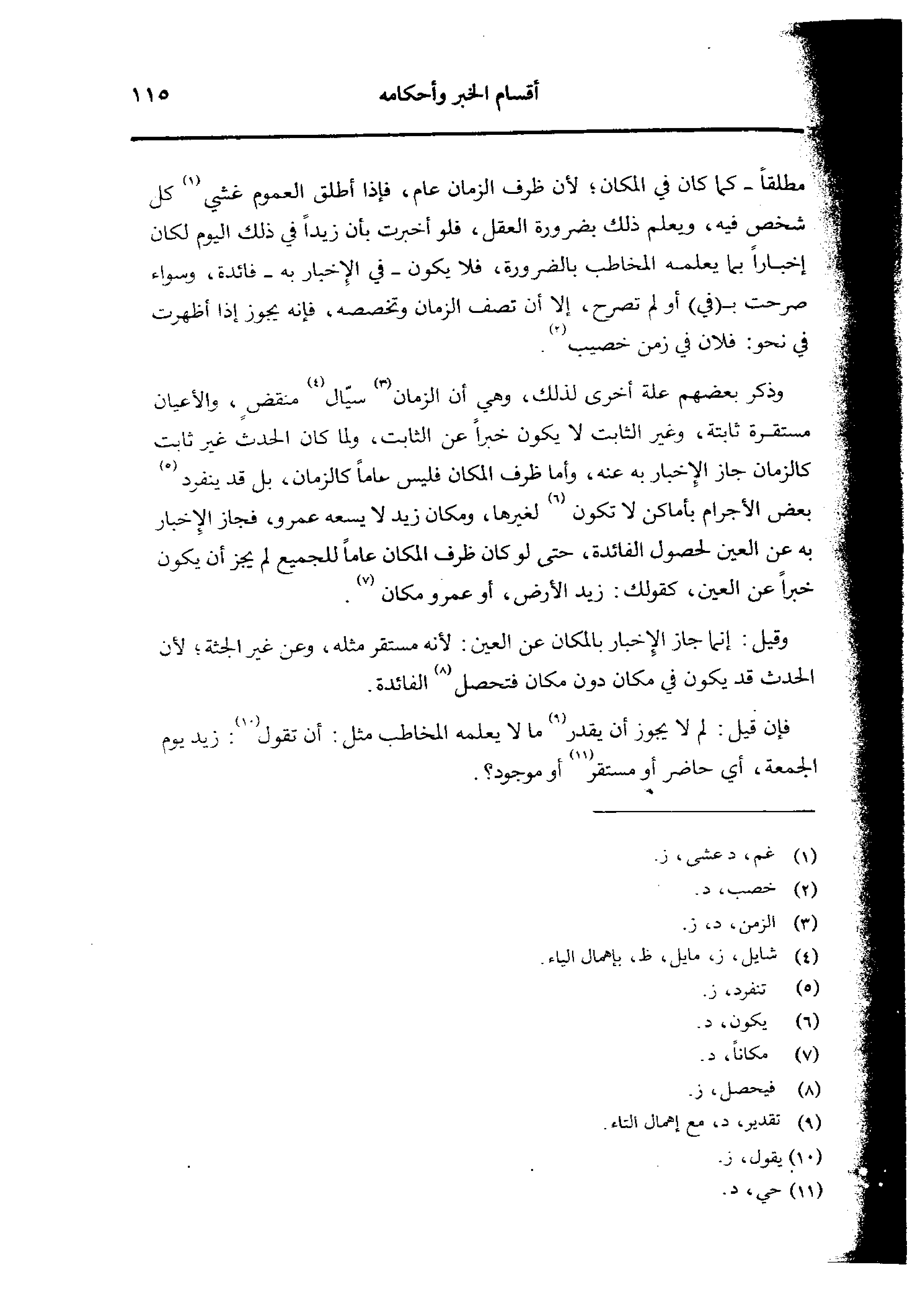 مطلقًا - كما كان في المكان؛ لأن ظرف الزمان عام، فإذا أطلق العموم غشي كل شخص فيه، ويعلم ذلك بضرورة العقل، فلو أخبرت بأن زيدًا في ذلك اليوم لكان إخبارًا بما يعلمه المخاطب بالضرورة، فلا يكون - في الإخبار به - فائدة، وسواء صرحت بـ ـ ـ (في) أو لم تصرح، إلا أن تصف الزمان وتخصصه، فإنه يجوز إذا أظهرت في نحو: فلان في زمن خصيب.