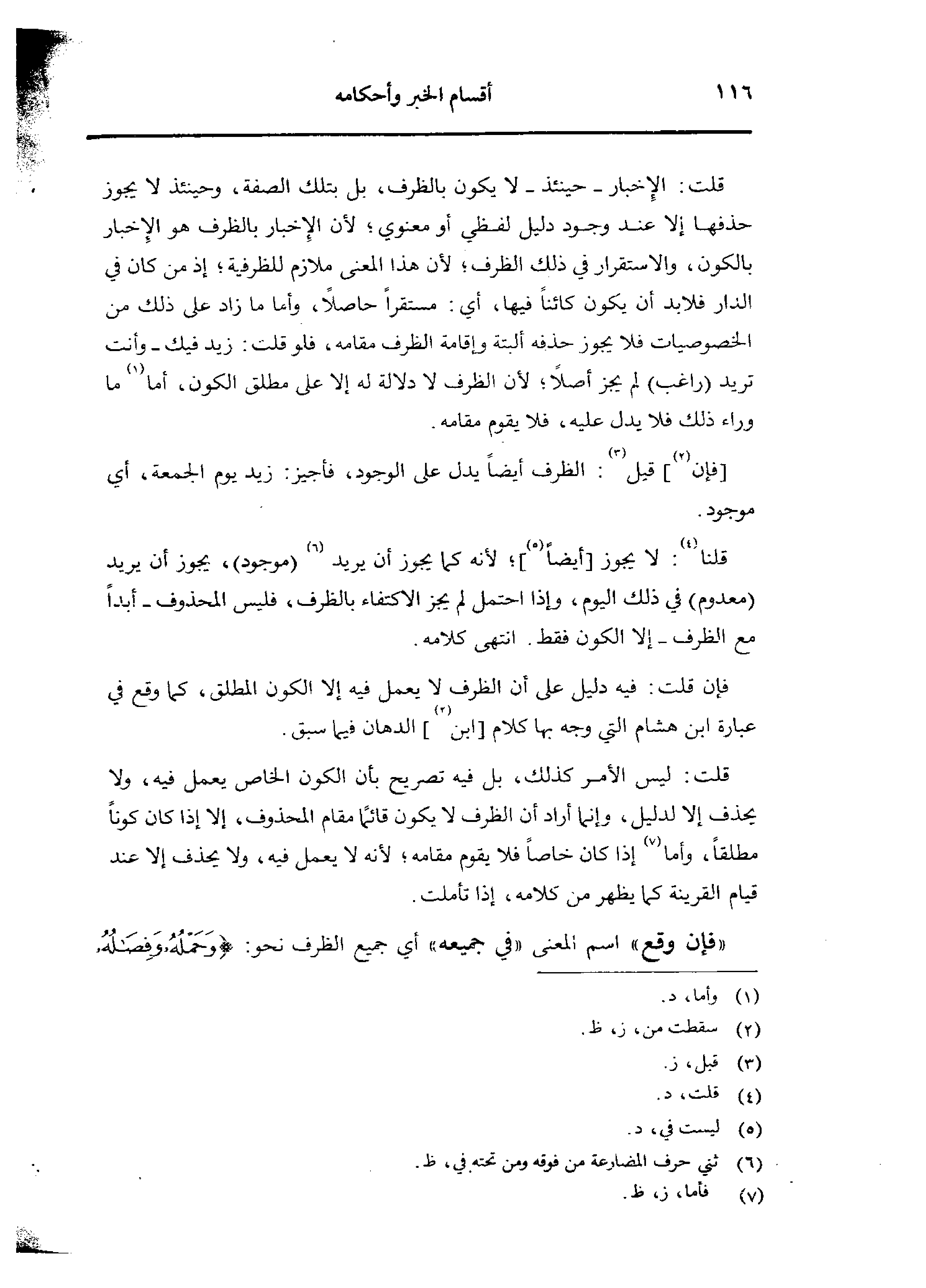 قلت: الإخبار - حينئذ - لا يكون بالظرف، بل بتلك الصفة، وحينئذ لا يجوز حذفها إلا عند وجود دليل لفظي أو معنوي؛ لأن الإخبار بالظرف هو الإخبار بالكون، والاستقرار في ذلك الظرف، لأن هذا المعنى ملازم للظرفية؛ إذ من كان في الدار فلابد أن يكون كائنًا فيها، أي: مستقرًا حاصلًا، وأما ما زدا على ذلك من الخصوصيات فلا يجوز حذفه ألبته وإقامة الظرف مقامه، فلو قلت: زيد فيك - وأنت تريد (راغب) لم يجز أصلًا؛ لأن الظرف لا دلالة له إلا على مطلق الكون، أما ما وراء ذلك فلا يدل عليه، فلا يقوم مقامه.