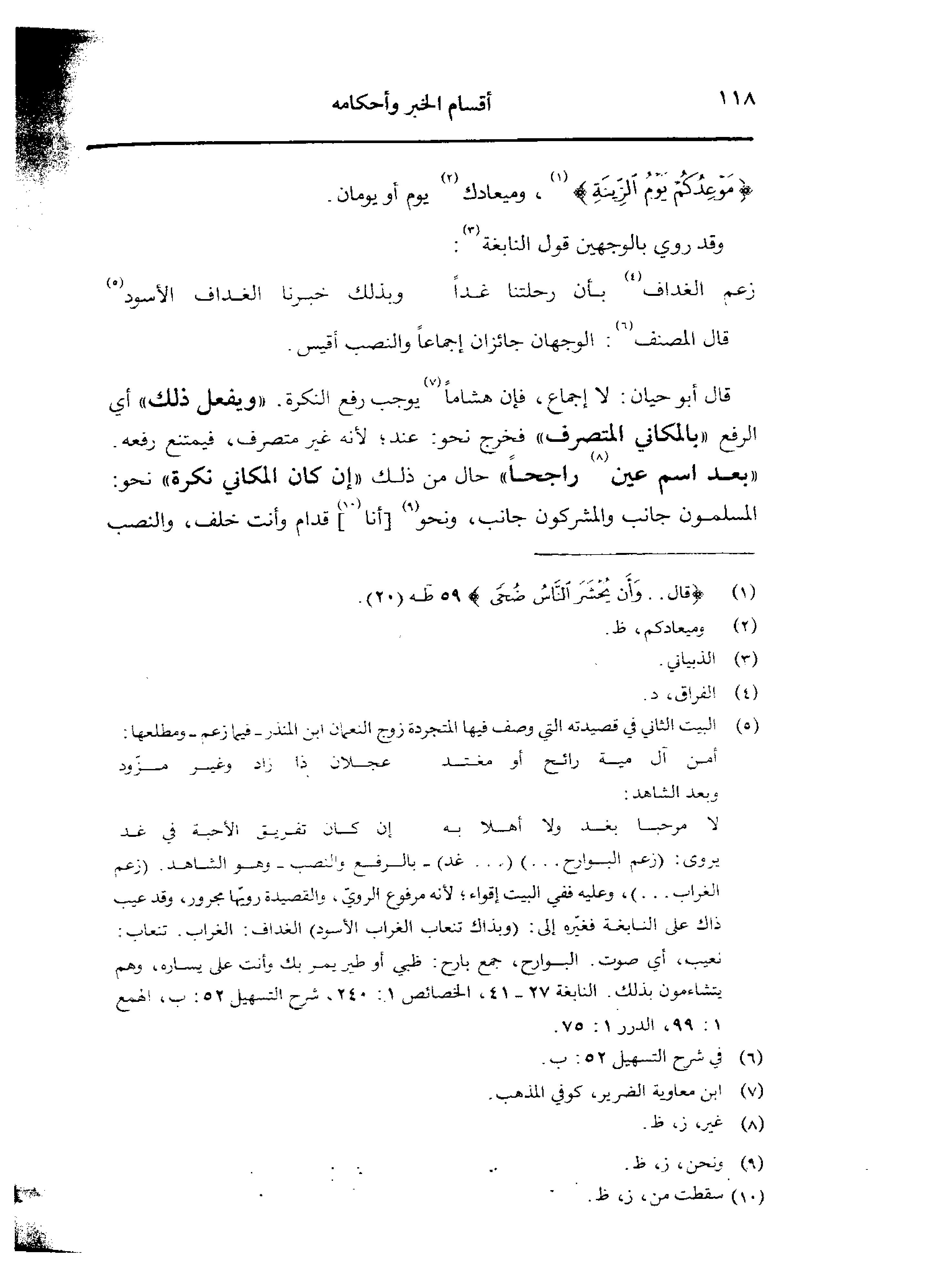 قال أبو حيان: لا إجماع، فإن هشامًا يوجب رفع النكرة. «ويفعل ذلك» أي الرفع «بالمكاني المتصرف» فخرج نحو: عند؛ لأنه غير متصرف، فيمتنع رفعه «بعد اسم عين راجحًا» حال من ذلك «إن كان المكاني نكرة» نحو: المسلمون جانب والمشركون جانب، ونحو [أنا] قدام وأنت خلف، والنصب