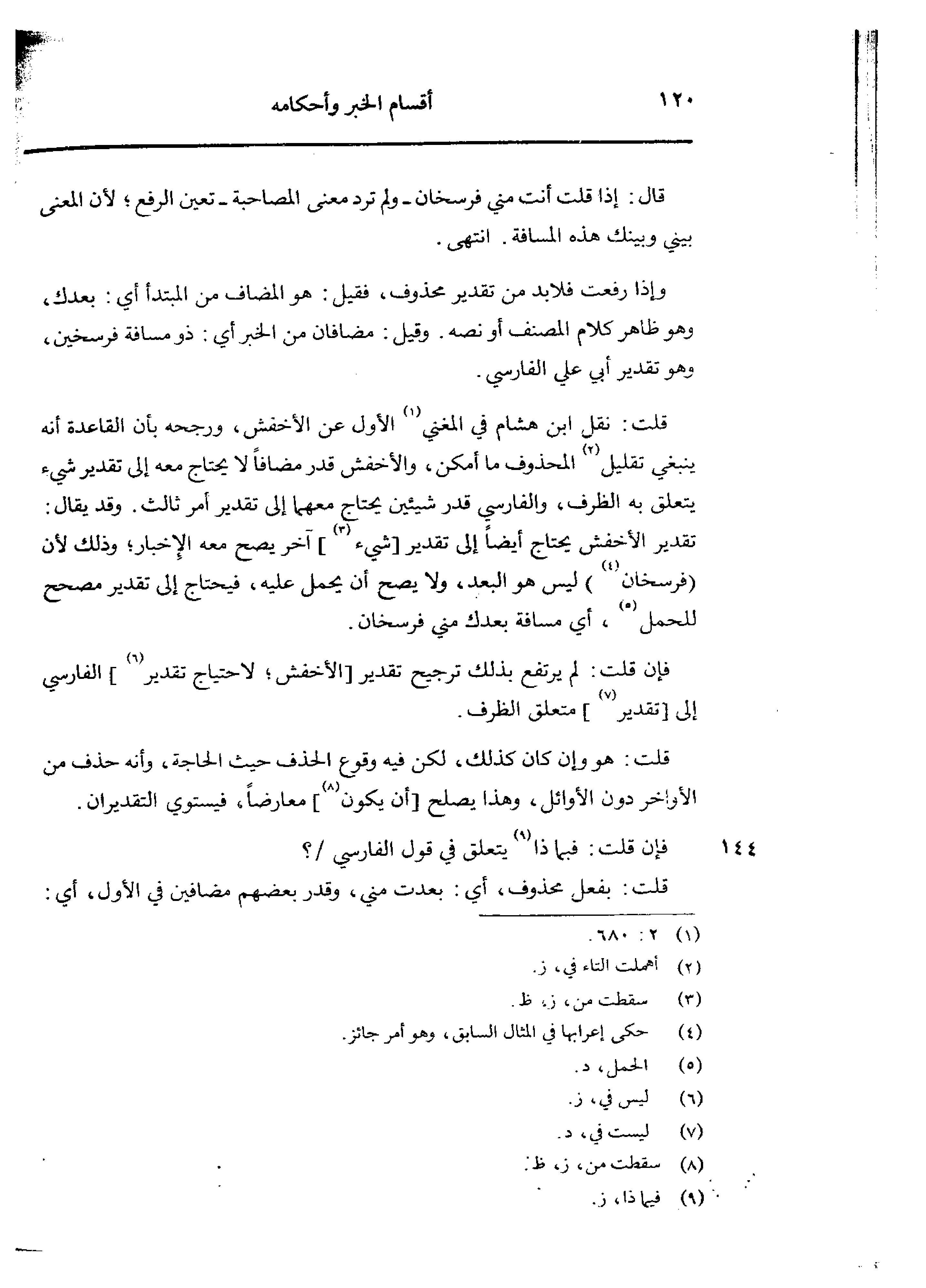 قلت: نقل ابن هشام في المغني الأول عن الأخفش، ورجحه بأن القاعدة أنه ينبغي تقليل المحذوف ما أمكن، والأخفش قدر مضافًا لا يحتاج معه إلى تقدير شيء يتعلق به الظرف، والفارسي قدر شيئين يحتاج معهما إلى تقدير أمر ثالث. وقد يقال: تقدير الأخفش يحتاج أيضًا إلى تقدير [شيء] آخر يصح معه الإخبار؛ وذلك لأن (فرسخان) ليس هو البعد، ولا يصح أن يحمل عليه، فيحتاج إلى تقدير مصحح للحمل، أي مسافة بعدك مني فرسخان.