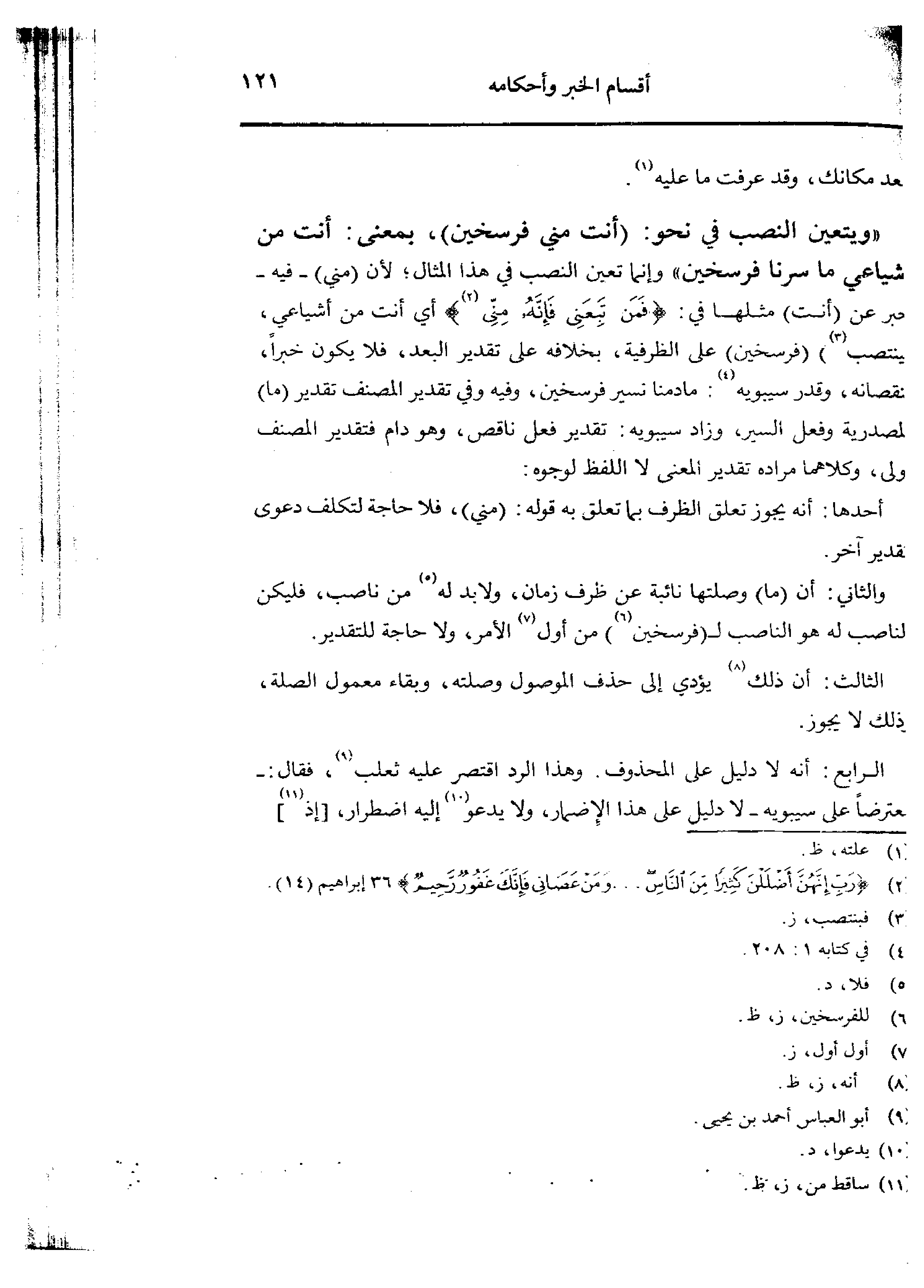 «ويتعين النصب في نحو: (أنت مني فرسخين)، بمعني: أنت من شياعي ما سرنا فرسخين» وإنما تعين النصب في هذا المثال؛ لأن (مني) - فيه - عبر عن (أنت) مثلها في: {فمن تبعني فإنه مني} أي أنت من أشياعي، ينتصب) (فرسخين) على الظرفية، بخلافه على تقدير البعد، فلا يكون خبرًا، نقصانه، وقدر سيبويه: ما دمنا نسير فرسخين، وفيه وفي تقدير المصنف تقدير (ما) لمصدرية وفعل السير، وزاد سيبويه: تقدير فعل ناقص، وهو دام فتقدير المصنف ولى، وكلاهما مراده تقدير المعنى لا اللفظ لوجوه: