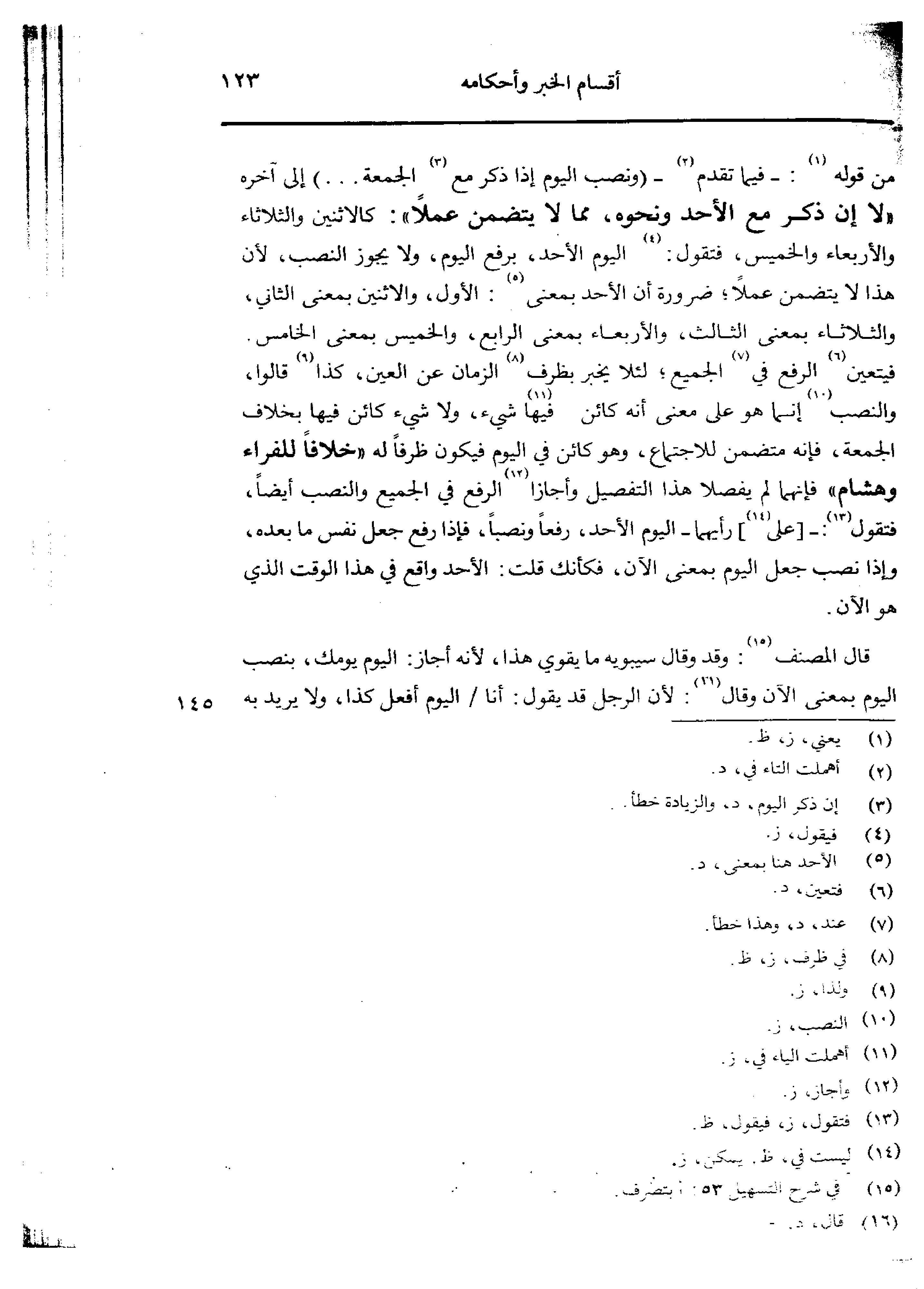 من قوله: - فيما قدم - (ونصب اليوم إذا ذكر مع الجمعة ... ) إلى آخره «لا إن ذكر مع الأحد ونحوه، مما لا يتضمن عملًا»: كالاثنين والثلاثاء والأربعاء والخميس، فتقول: اليوم الأحد، برفع اليوم، ولا يجوز النصب، لأن هذا لا يتضمن عملًا؛ ضرورة أن الأحد بمعنى: الأول، والاثنين بمعنى الثاني، والثلاثاء بمعنى الثالث، والأربعاء بمعنى الرابع، والخميس بمعنى الخامس. فيتعين الرفع في الجميع؛ لئلا يخبر بظرف الزمان عن العين، كذا قالوا، والنصب إنما هو على معنى أنه كائن فيها شيء، ولا شيء كائن فيها بخلاف الجمعة، فإنه متضمن للاجتماع، وهو كائن في اليوم فيكون ظرفًا له «خلافًا للفراء وهشام» فإنهما لم يفصلا هذا التفصيل وأجازا الرفع في الجميع والنصب أيضًا، فتقول: -[على] رأيهما - اليوم الأحد، رفعًا ونصبًا، فإذا رفع جعل نفس ما بعده، وإذا نصب جعل اليوم بمعنى الآن، فكأنك قلت: الأحد واقع في هذا الوقت الذي هو الآن.