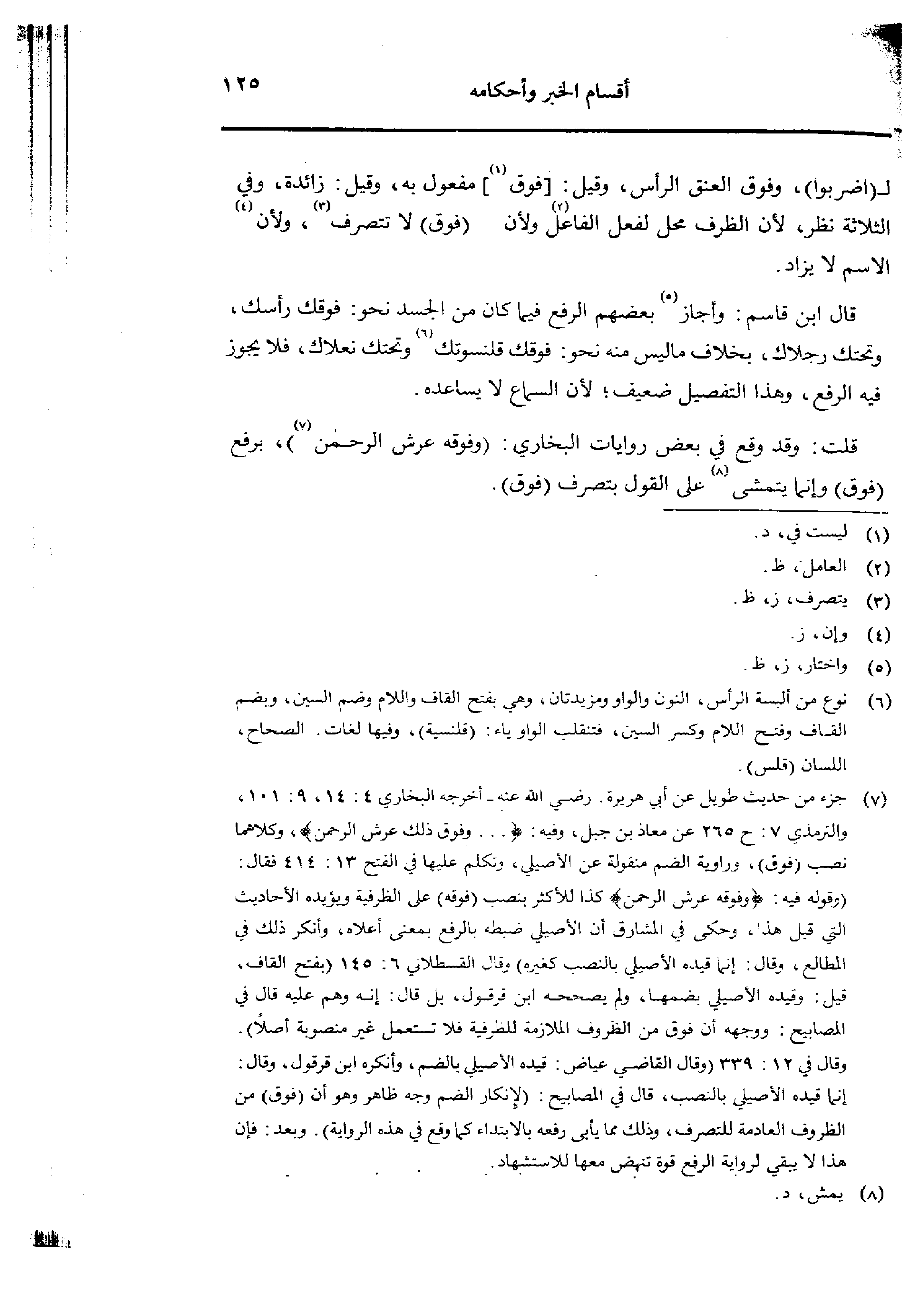 قلت: وقد وقع في بعض روايات البخاري: (وفوقه عرش الرحمن)، برفع (فوق) وإنما يتمشى على القول بتصرف (فوق).