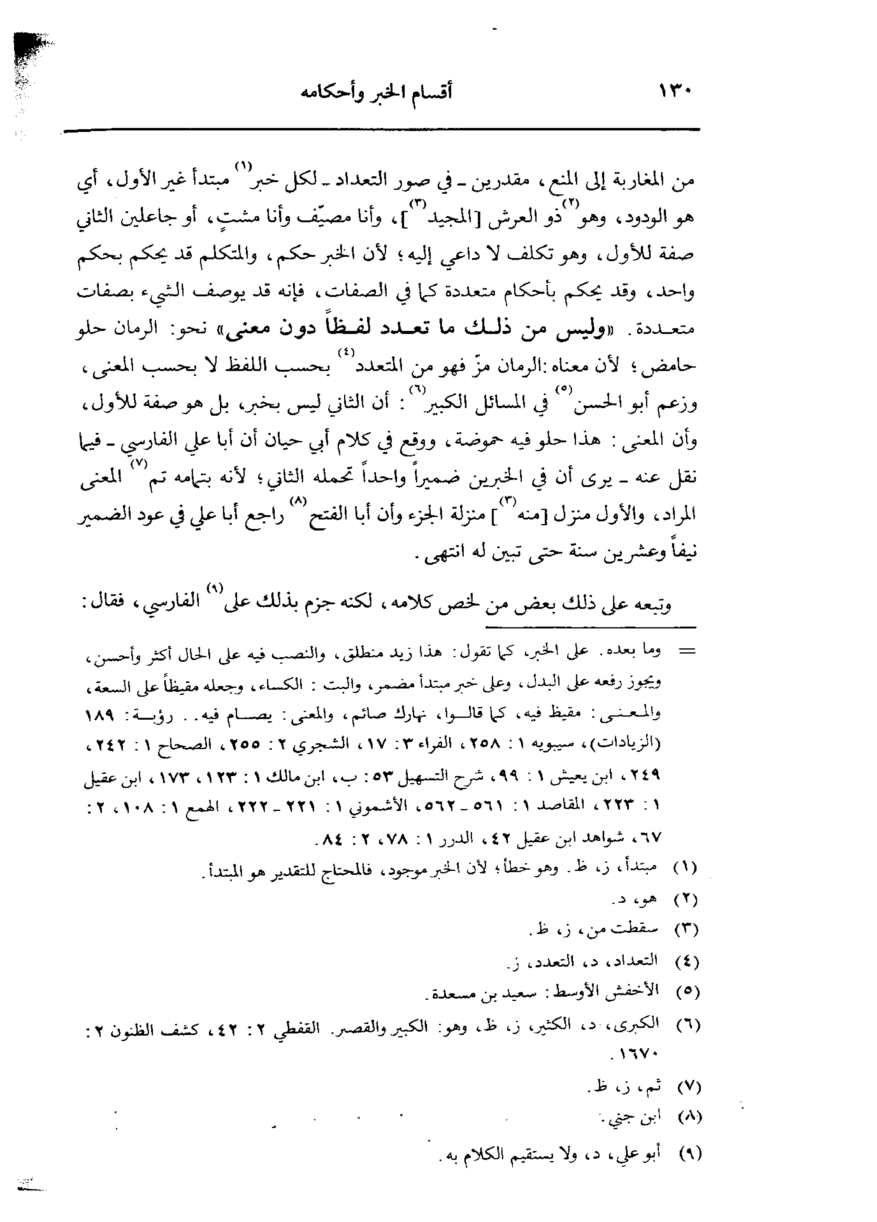 من المغاربة إلى المنع، مقدرين - في صور التعداد - لكل خبر مبتدأ غير الأول، أي هو الودود، وهو ذو العرش [المجيد]، وأنا مصيف وأنا مشت، أو جاعلين الثاني صفة للأول، وهو تكلف لا داعي إليه؛ لأن الخبر حكم، والمتكلم قد يحكم بحكم واحد، وقد يحكم بأحكام متعددة كما في الصفات، فإنه قد يوصف الشيء بصفات متعددة. «وليس من ذلك ما تعدد لفظًا دون معنى» نحو: الرمان حلو حامض؛ لأن معناه: الرمان مر فهو من المتعدد بحسب اللفظ لا بحسب المعنى، وزعم أبو الحسن في المسائل الكبير: أن الثاني ليس بخبر، بل هو صفة للأول، وأن المعنى: هذا حلو فيه حموضة، ووقع في كلام أبي حيان أن أبا علي الفارسي - فيما نقل عنه - يرى أن في الخبرين ضميرًا واحدًا تحمله الثاني؛ لأنه بتمامه تم المعنى المراد، والأول منزل [منه] منزلة الجزء وأن أبا الفتح راجع أبا علي في عود الضمير نيفًا وعشرين سنة حتى تبين له انتهى.