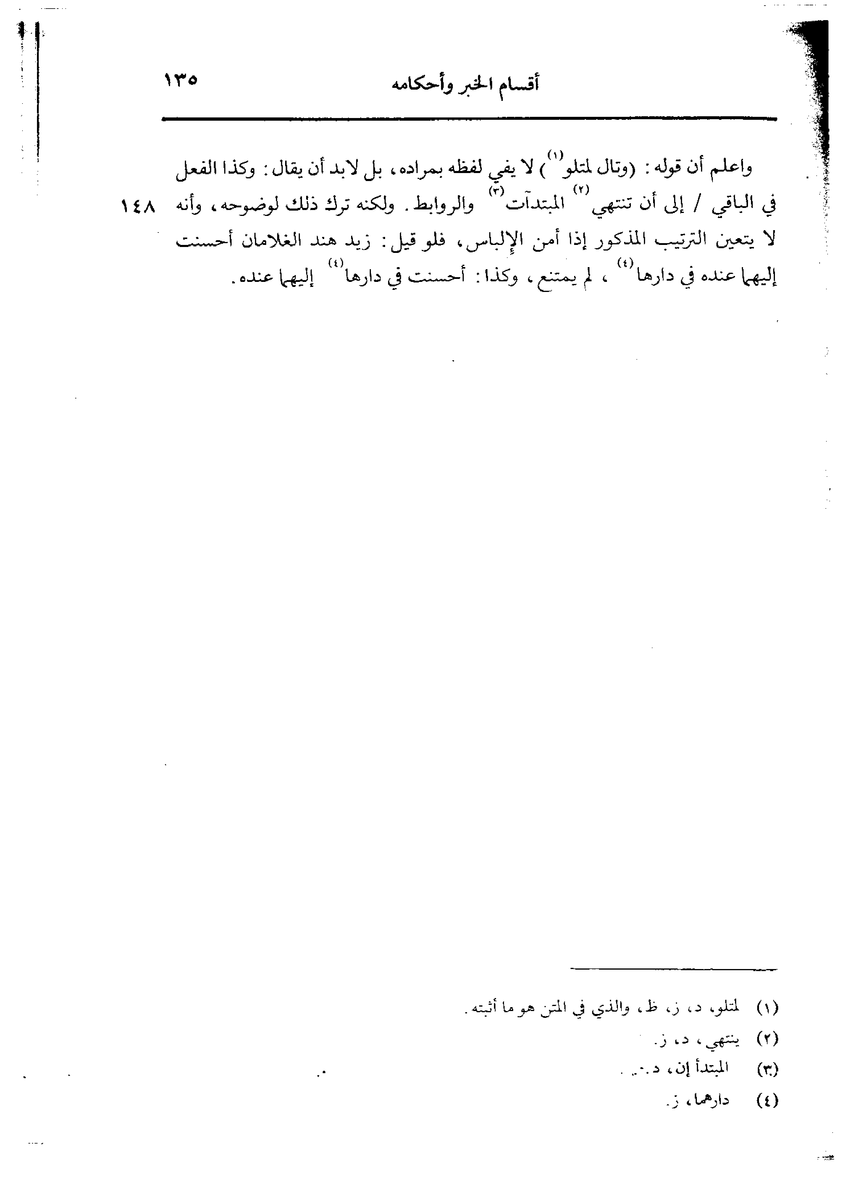 واعلم أن قوله: (وتال لمتلو) لا يفي لفظه بمراده، بل لابد أن يقال: وكذا الفعل في الباقي/ إلى أن تنتهي المبتدآت والروابط. ولكنه ترك ذلك لوضوحه، وأنه 148 لا يتعين الترتيب المذكور إذا أمن الإلباس، فلو قيل: زيد هنا الغلامان أحسنت إليهما عنده في دارها، لم يمتنع، وكذا: أحسنت في دارها إليهما عنده.