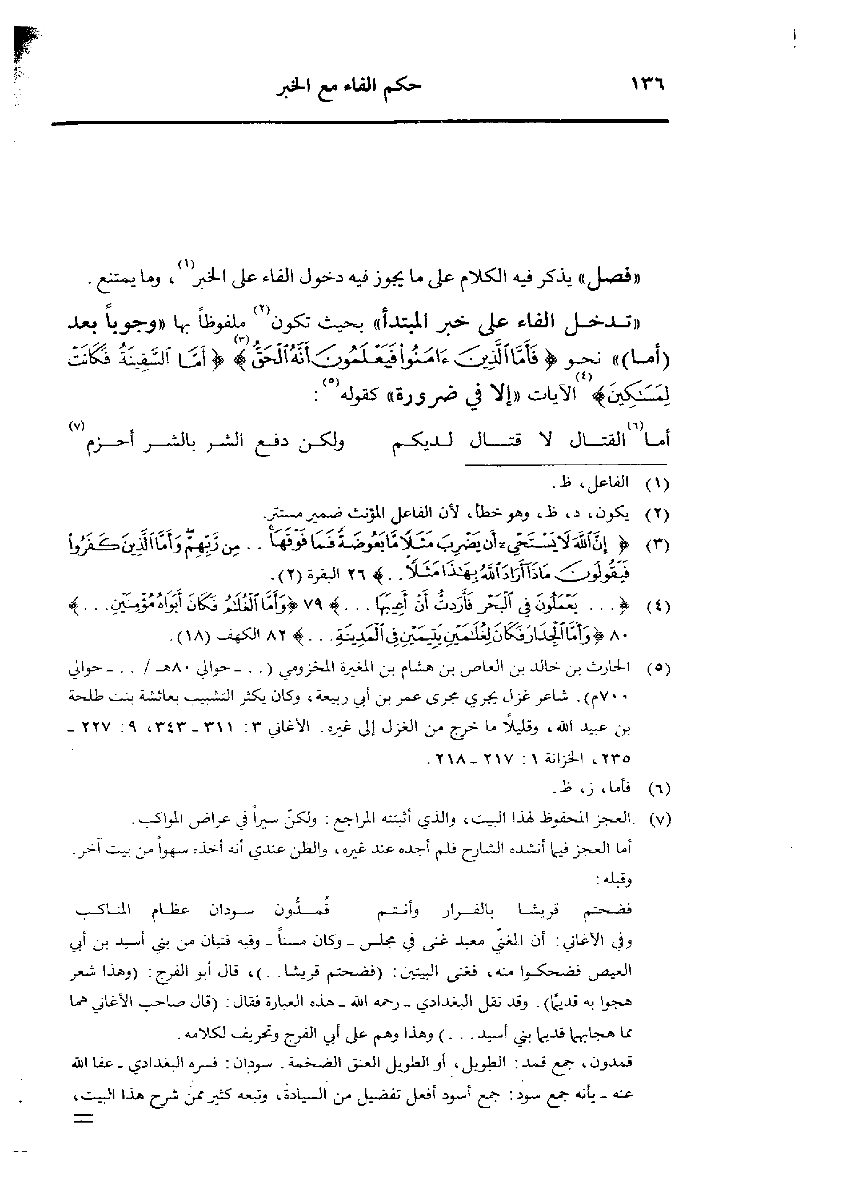 «تدخل الفاء على خبر المبتدأ» بحيث تكون ملفوظًا بها «وجوبًا بعد (أما)» نحو {فأما الذين امنوا فيعلمون أنه الحق} {أما السفينة فكانت لمساكين} الآيات «إلا في ضرورة» كقوله: