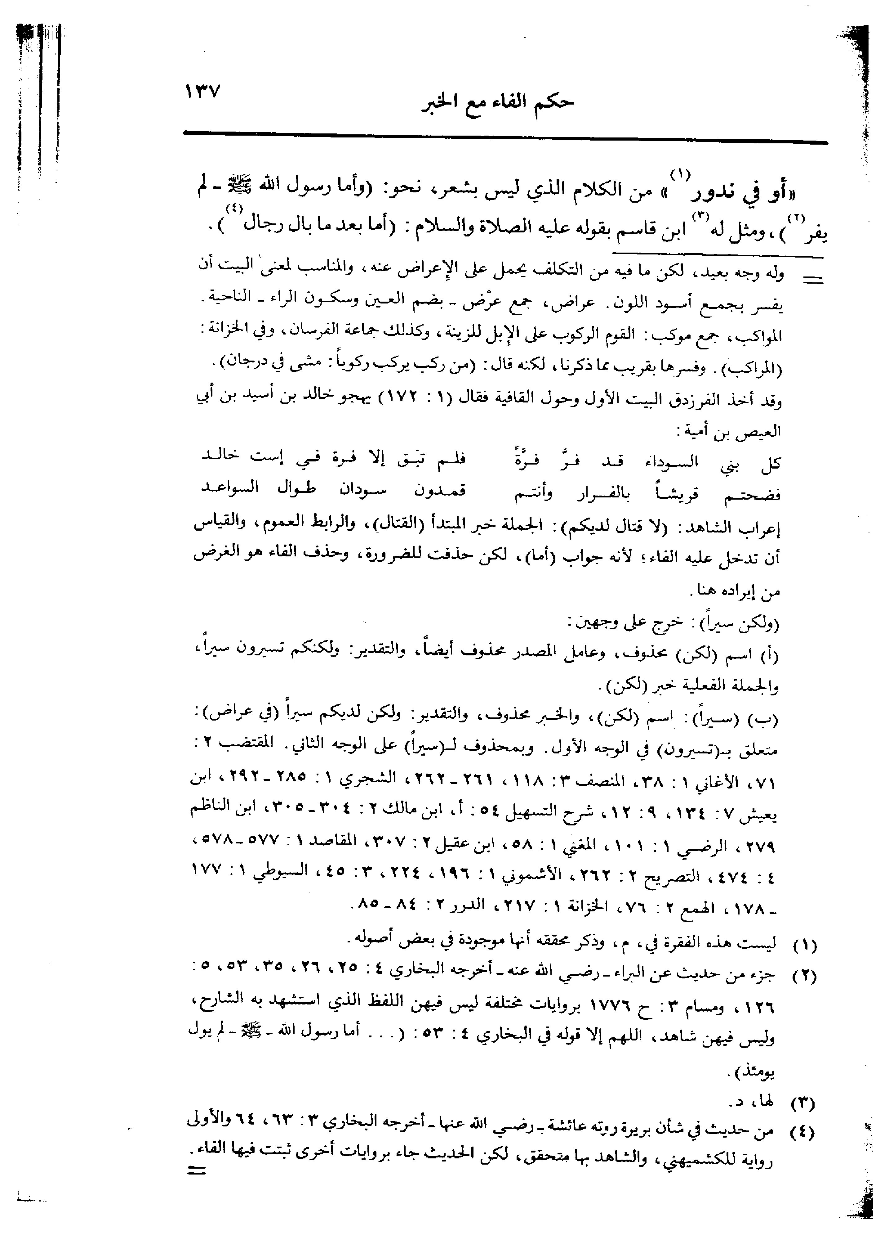 «أو في ندور» من الكلام الذي ليس بشعر، نحو: (وأما رسول الله صلى الله عليه وسلم - لم يفر)، ومثل له ابن قاسم بقوله عليه الصلاة والسلام: (أما بعد ما بال رجال).