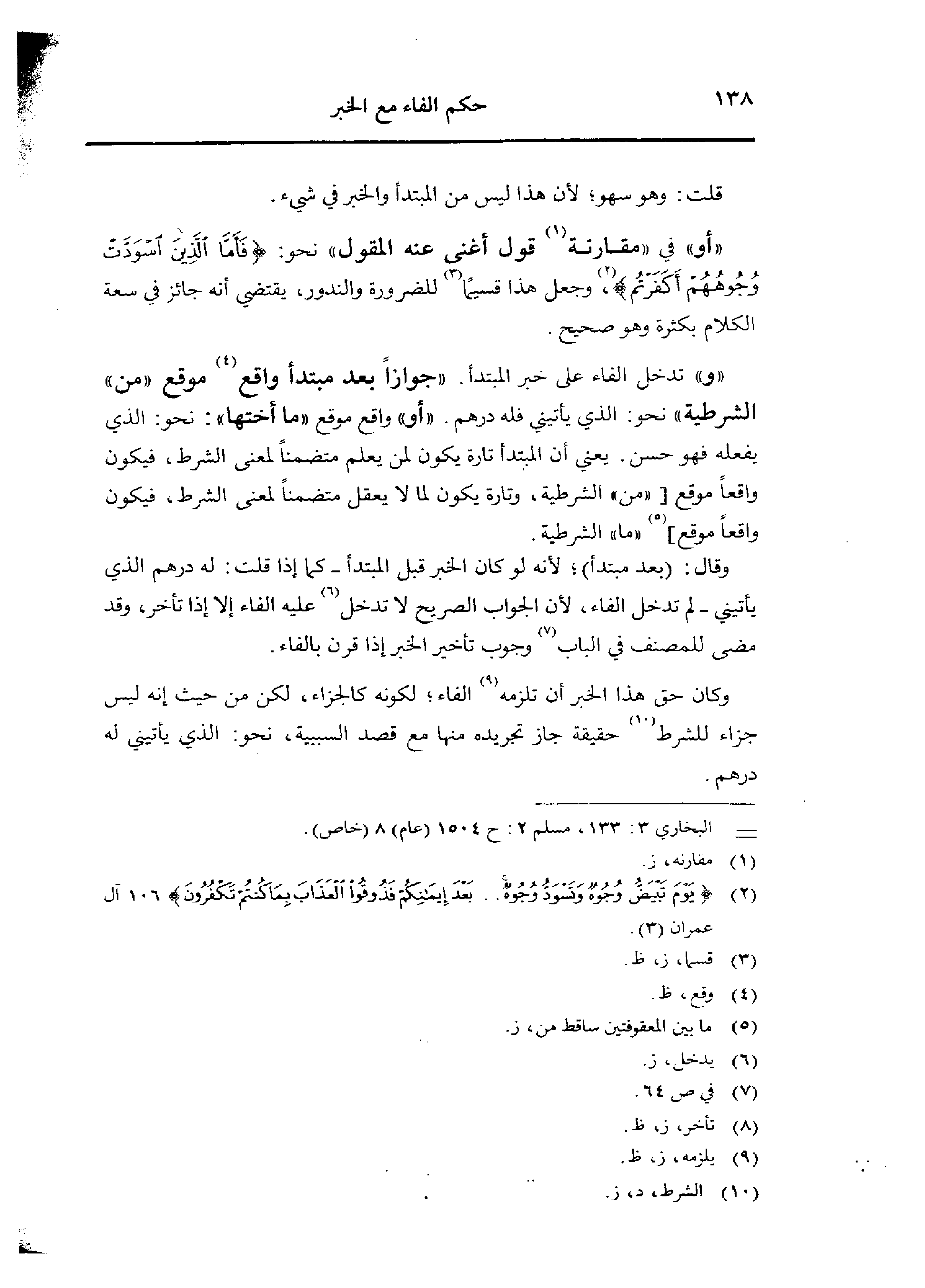 «و» تدخل الفاء على خبر المبتدأ. «جوازًا بعد مبتدأ واقع موقع «من» الشرطية» نحو: الذي يأتيني فله درهم. «أو» واقع موقع «ما أختها»: نحو: الذي يفعله فهو حسن. يعني أن المبتدأ تارة يكون لمن يعلم متضمنًا لمعنى الشرط، فيكون واقعًا موقع [«من» الشرطية، وتارة يكون لما لا يعقل متضمنًا لمعنى الشرط، فيكون واقعًا موقع] «ما» الشرطية.