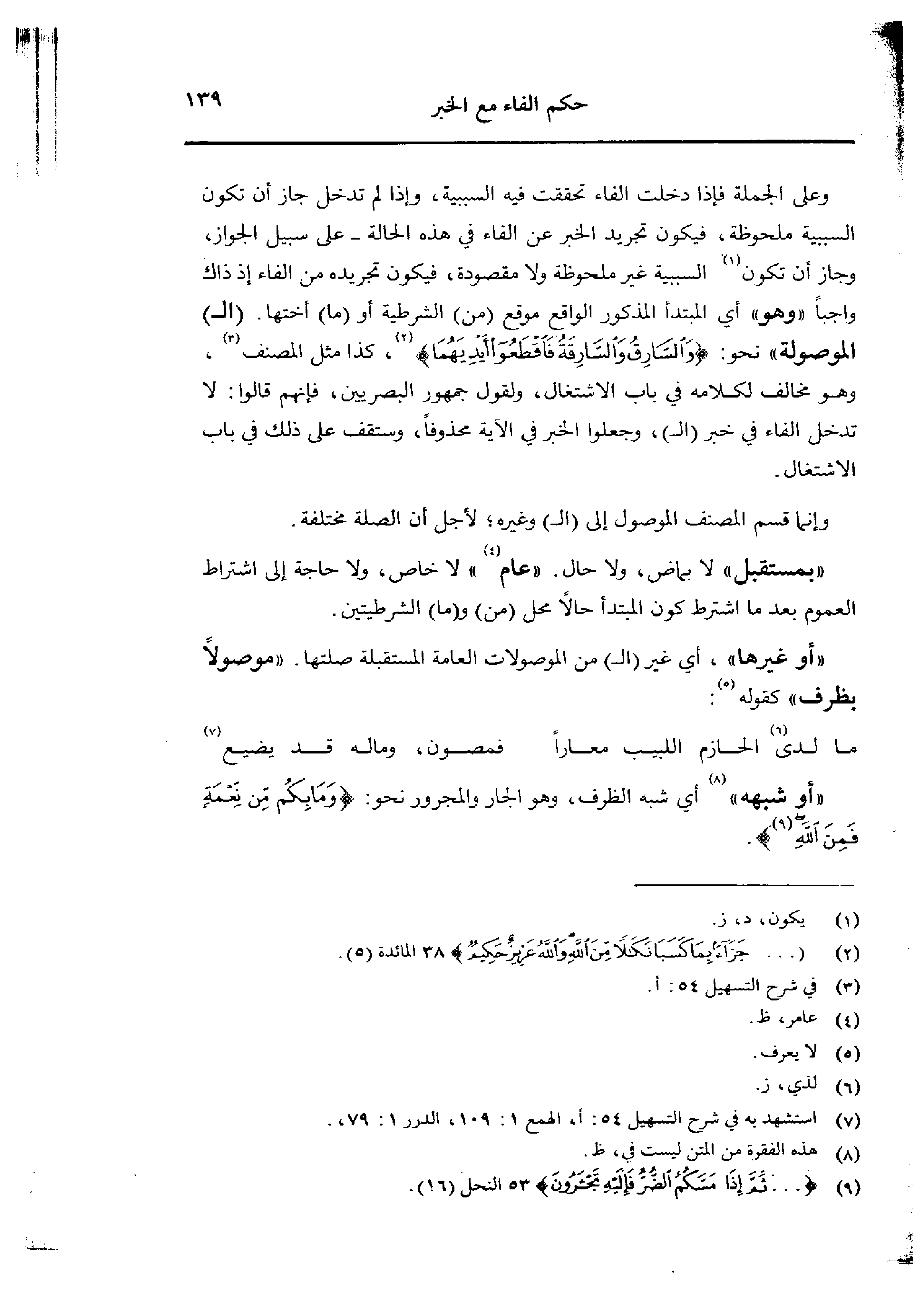 وعلى الجملة فإذا دخلت الفاء تحققت فيه السببية، وإذا لم تدخل جاز أن تكون السببية ملحوظة، فيكون تجريد الخبر عن الفاء في هذه الحالة - على سبيل الجواز، وجاز أن تكون السببية غير ملحوظة ولا مقصودة، فيكون تجريده من الفاء إذ ذاك واجبًا «وهو» أي المبتدأ المذكور الواقع موقع (من) الشرطية أو (ما) أختها. (الـ) الموصولة» نحو: {والسارق والسارقة فاقطعوا أيديهما}، كذا مثل المصنف، وهو مخالف لكلامه في باب الاشتغال، ولقول جمهور البصريين، فإنهم قالوا: لا تدخل الفاء في خبر (الـ ـ ـ)، وجلعوا الخبر في الآية محذوفًا، وستقف على ذلك في باب الاشتغال.